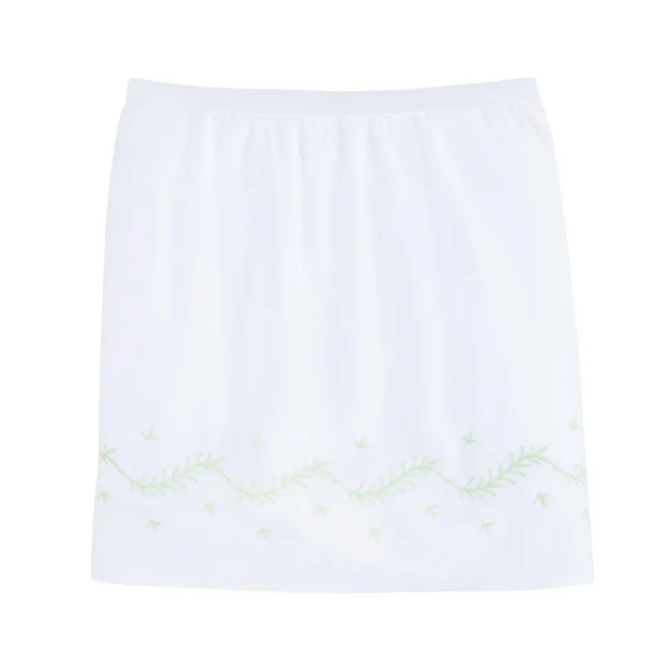 Shannon Latham founded Little English in 2004 with the belief that children should always be well-dressed. Employing hand-smocking, hand-embroidery, and the very best fabrics, Shannon and her daughter design timeless pieces that will be used for generations to come. The ideal finishing touch to any little one’s nursery, the Embroidered Crib Skirt in Meadow a crisp white cotton backdrop with light green floral vines delicately embroidered at the base of the skirt. Pair with the matching embroidered crib sheet and add a monogram for an extra personal touch.