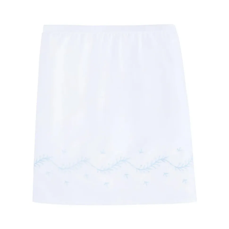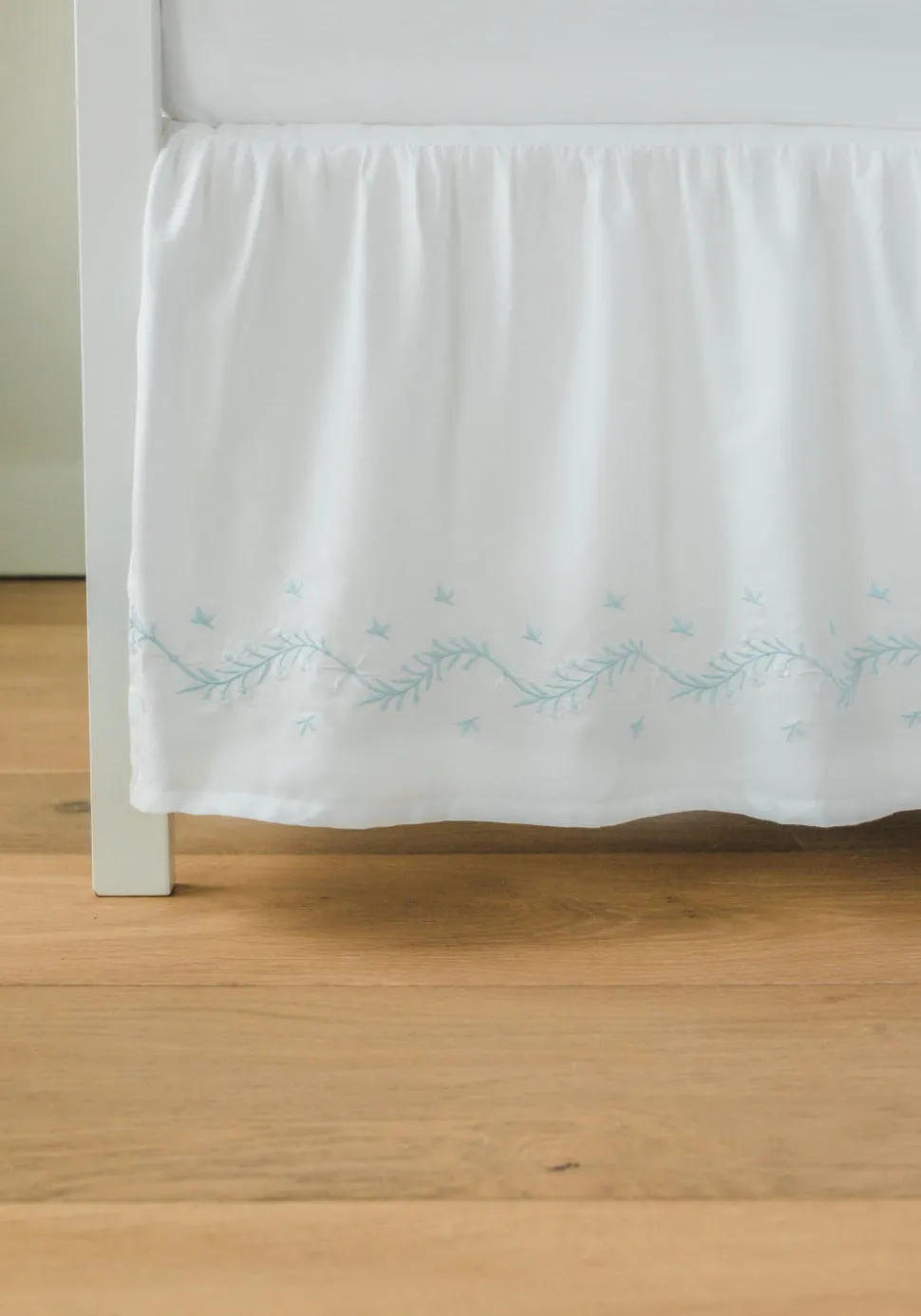 Shannon Latham founded Little English in 2004 with the belief that children should always be well-dressed. Employing hand-smocking, hand-embroidery, and the very best fabrics, Shannon and her daughter design timeless pieces that will be used for generations to come. The ideal finishing touch to any little one’s nursery, the Embroidered Crib Skirt in Sky a crisp white cotton backdrop with light blue floral vines delicately embroidered at the base of the skirt. Pair with the matching embroidered crib sheet and add a monogram for an extra personal touch.