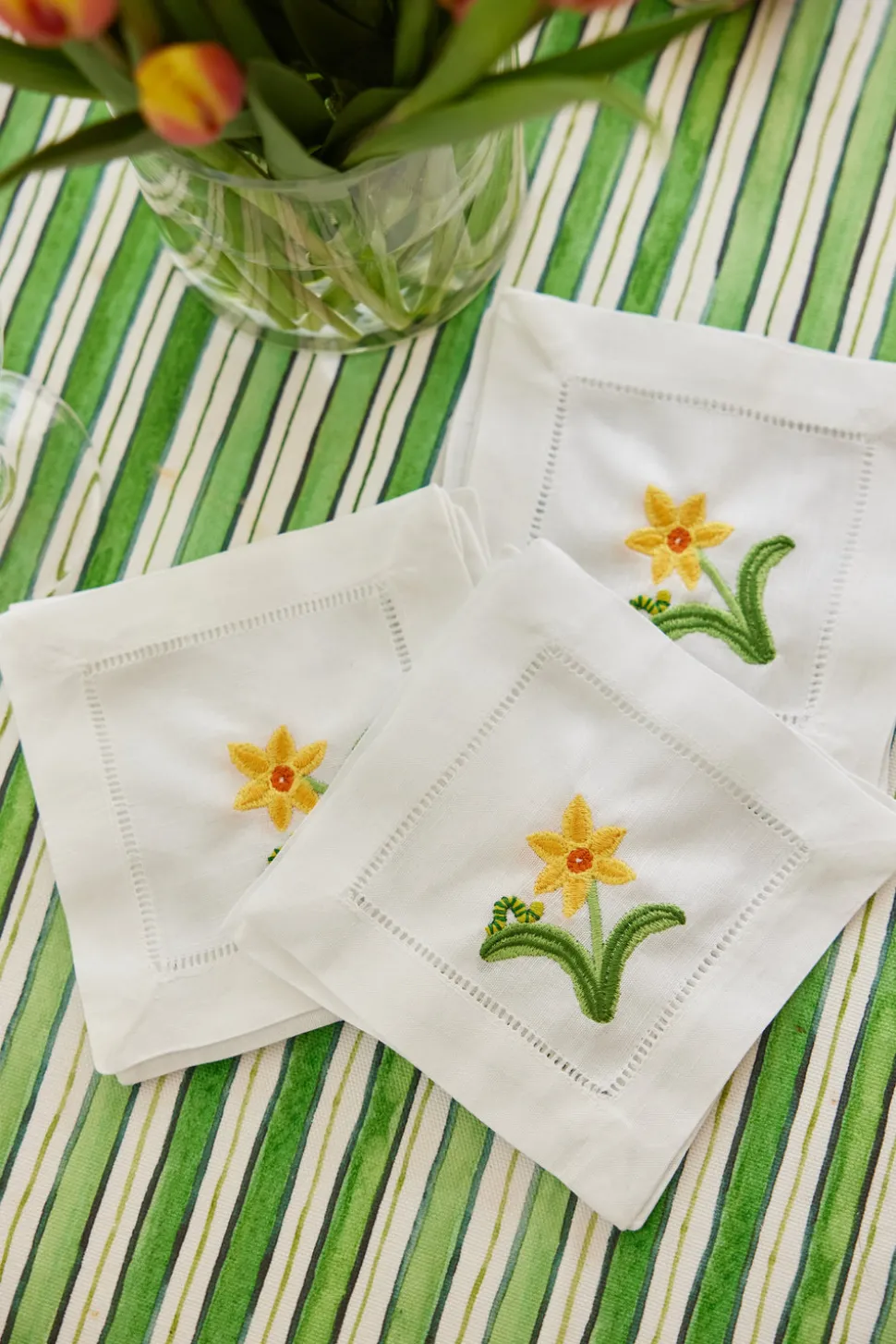 Originally from Asheville, North Carolina, Catherine Owen Design is an artist and designer based in Greenwich, Connecticut. After earning her design degree from Parsons, she honed her craft working for interior designer Katie Ridder Inc. in New York City. Inspired by her work on textiles and wallcoverings, Catherine founded her own brand, where she now specializes in custom commissions made for your home. The Embroidered Daffodil & Inch Worm Cocktail Napkins, Set of 4 feature adorable little inch worms and beautiful floral motifs. Ideal to adorn your tablescape for any get-together.