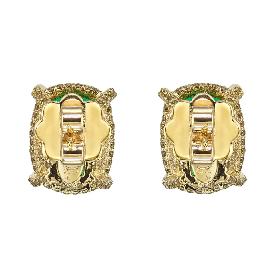 London-based Anabela Chan’s background in architecture and luxury fashion led to the first fine jewelry line to champion laboratory-grown gemstones. Today, its artisanal craftsmanship and sustainable innovations have found a place in the collections of royals, Rihanna, Taylor Swift, and sophisticated women worldwide. A whimsical twist on a classic, inspired by the delicate beauty of butterfly wings, these stunning stud earrings feature laboratory-grown and created gemstones including two flawless cushion-cut green emeralds of 10 carats each, in an intricate setting of 18K gold vermeil and 14K gold posts, with pavé peridots.