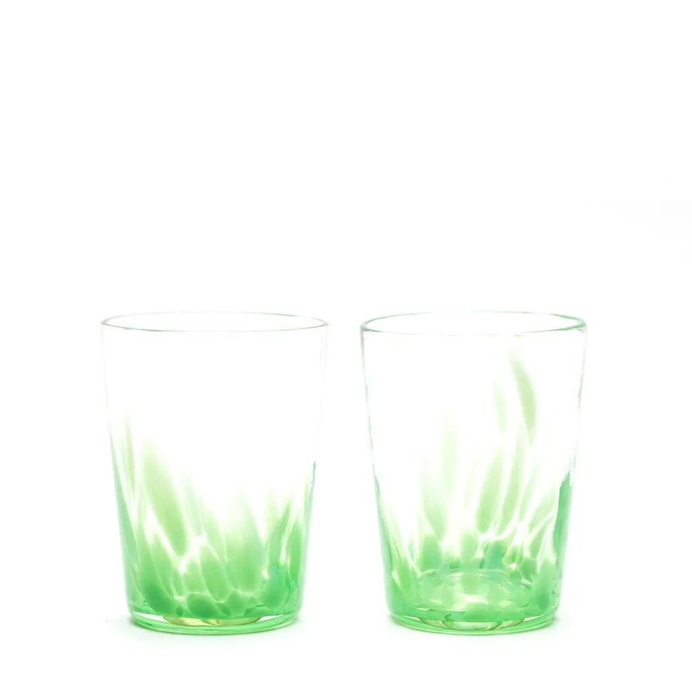 The Transparent Spotted Tumblers are hand-blown, one-of-a-kind drinking glasses accented with emerald green spots. Each is unique with slight variations in shape and size. It is the nuance that gives these glass pieces soul.