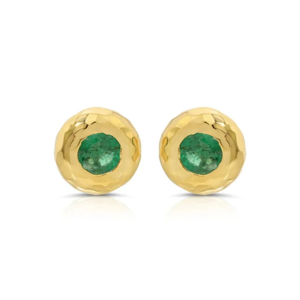 18K yellow gold. Emerald gemstones. Also available in diamond, ruby, or sapphire. Signature hammered finish. Made in the USA.