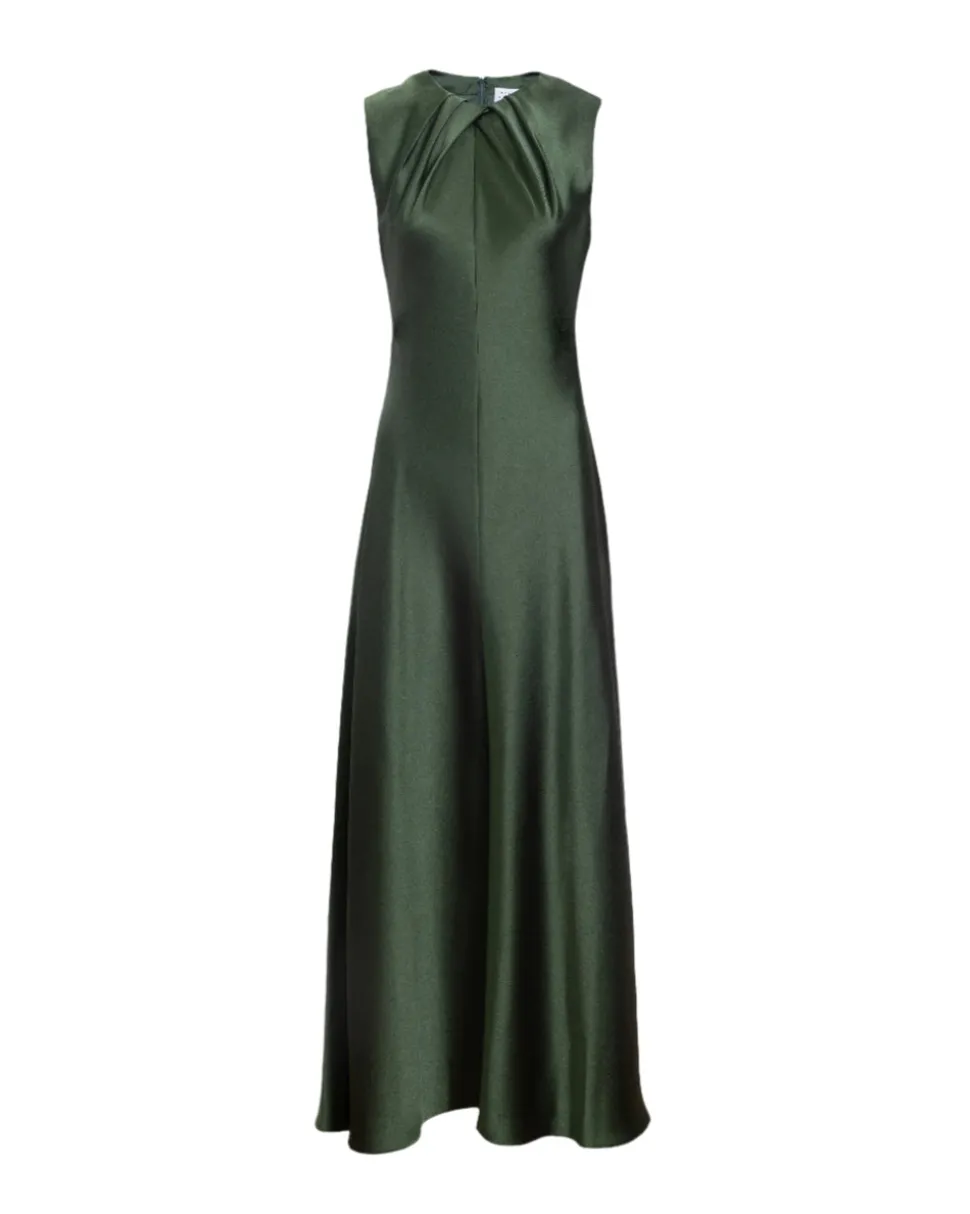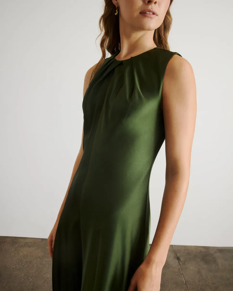 Creating clothing that inspires confidence, celebration, and community, Tanya Taylor is a New York-based womenswear brand whose mission is to provide practicality and style to a range of ready-to-wear in inclusive sizes. Each collection is thoughtfully designed through the artful use of color, texture, and original hand-painted prints. The Emily Dress in Forest Green is a standout occasion silhouette designed in luminous satin crepe for fluid drape and elevated ease. Featuring a crew neckline with delicately placed knife pleating and a bias-cut construction, this maxi-length dress offers timeless elegance with flattering proportions.