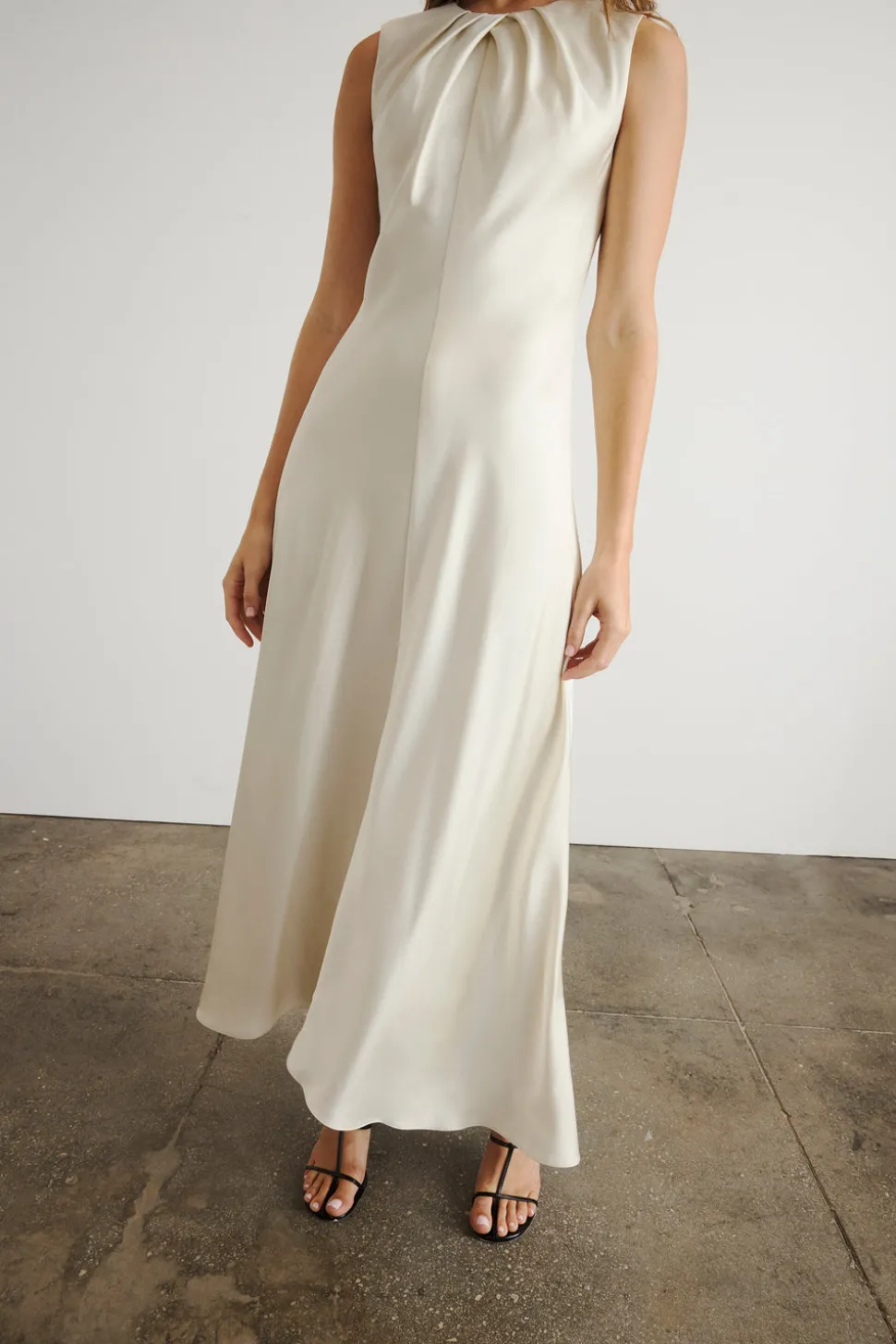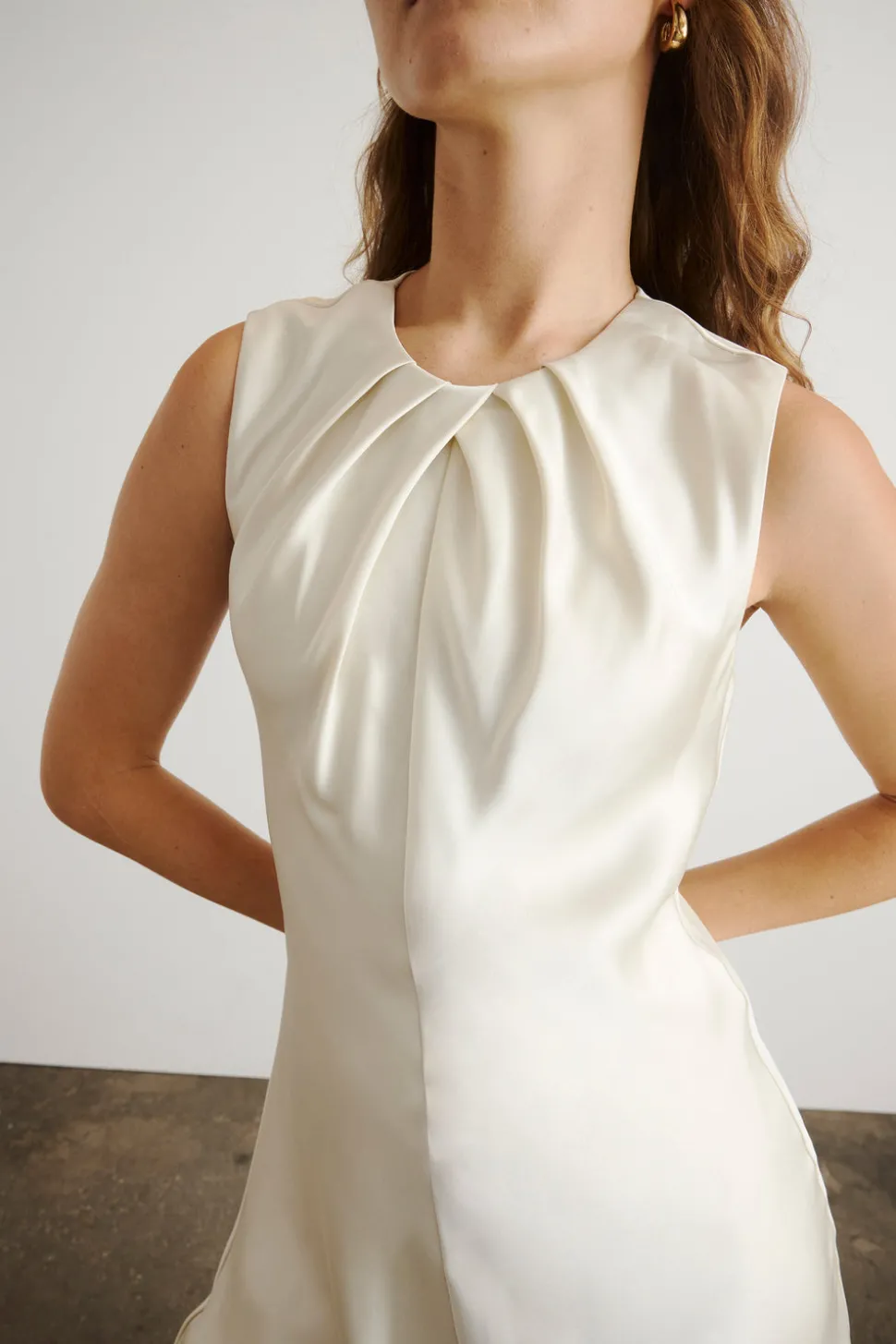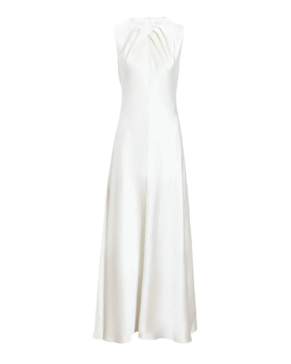 Creating clothing that inspires confidence, celebration, and community, Tanya Taylor is a New York-based womenswear brand whose mission is to provide practicality and style to a range of ready-to-wear in inclusive sizes. Each collection is thoughtfully designed through the artful use of color, texture, and original hand-painted prints. The Emily Dress in Ivory is a sophisticated take on occasionwear, crafted in a fluid satin crepe that drapes with graceful ease. Designed with a crew neckline and artfully placed knife pleats, this figure-skimming maxi falls in a flattering bias cut for timeless elegance.
