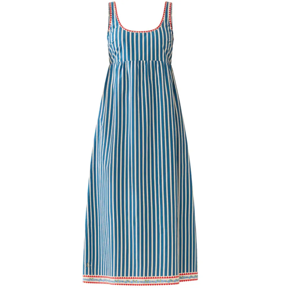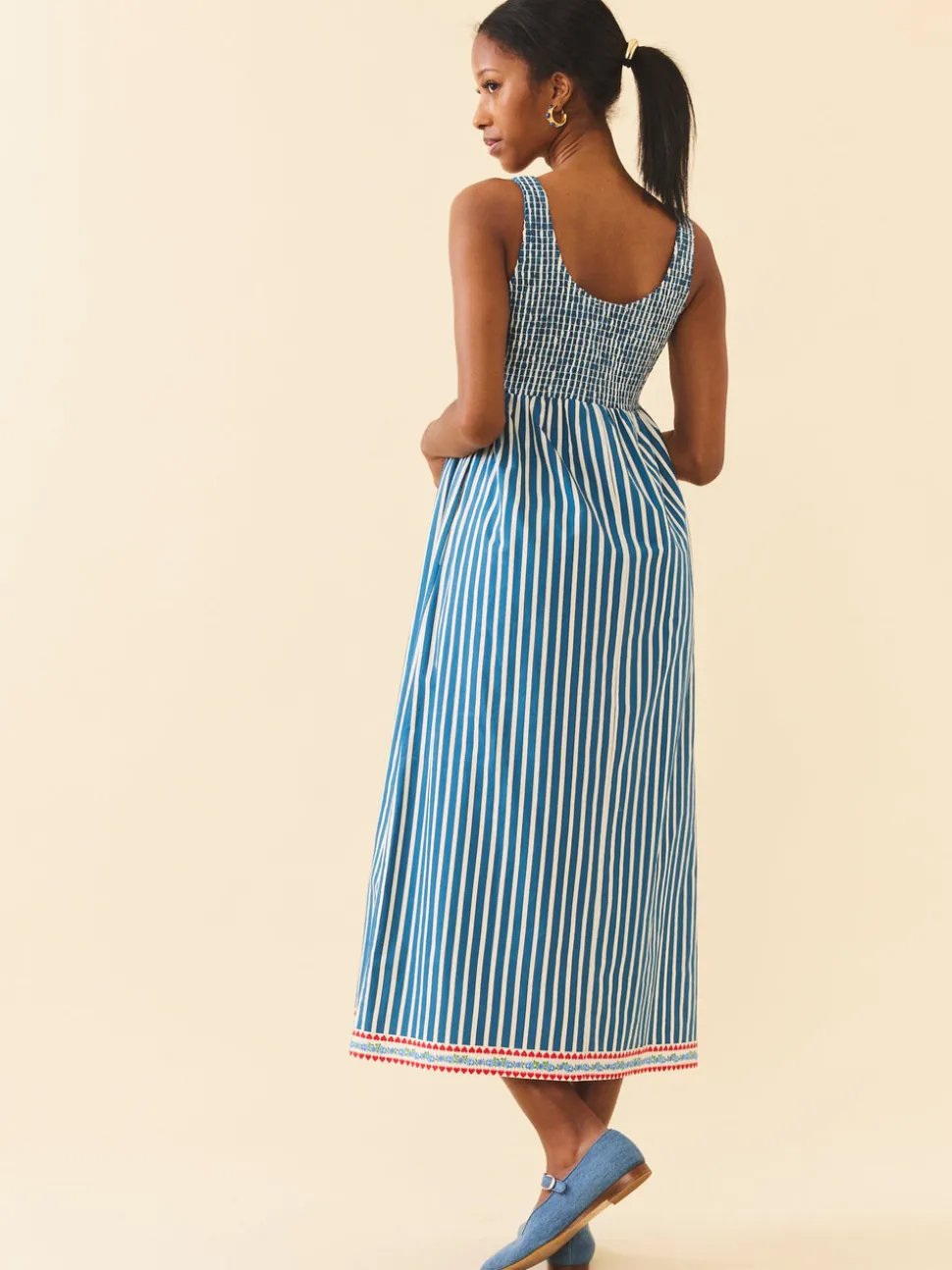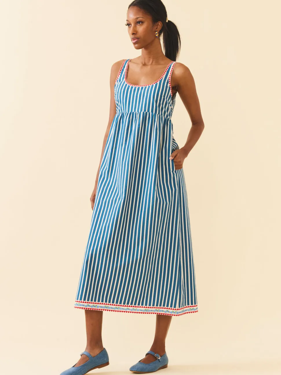 100% cotton. Side zipper closure. Smocked back for support. Side pockets. Fully lined. Dress printed in coastal blue and white stripes with bold red hem details. Made in India.