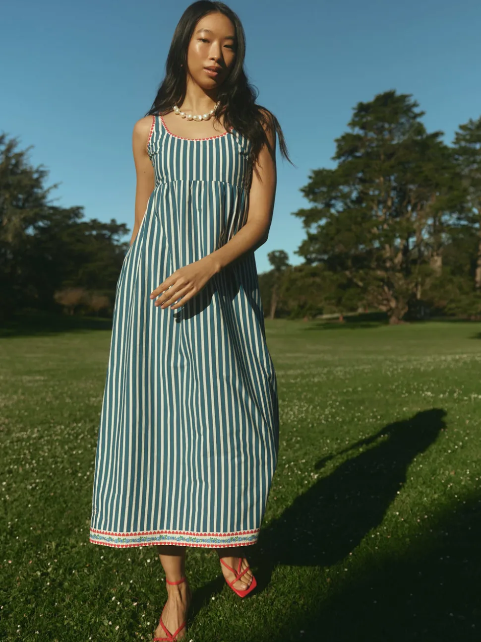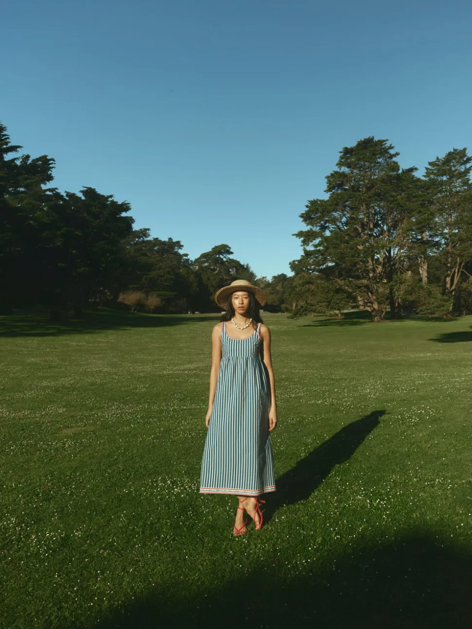Tomboy looks, girly-girl styles, and an always fashionable approach define Eddy’s aesthetic. With a focus on bold and feminine silhouettes, Eddy dresses and tops pair elevated California bohemian with global inspiration; these are clothes designed to make you feel good inside and out. The Emily Dress in Navy Stripe is the epitome of easy-wear elegance. An empire waist that flows with ease into full skirt. Updated from previous releases to a smocked back allowing for added comfort to move with your body as needed. Dress printed in coastal blue and white stripes with bold red hem details.