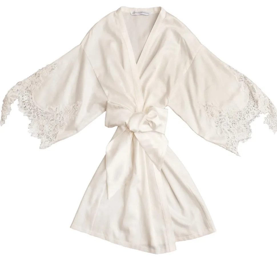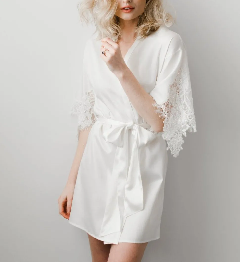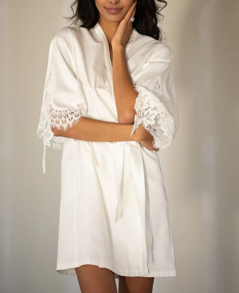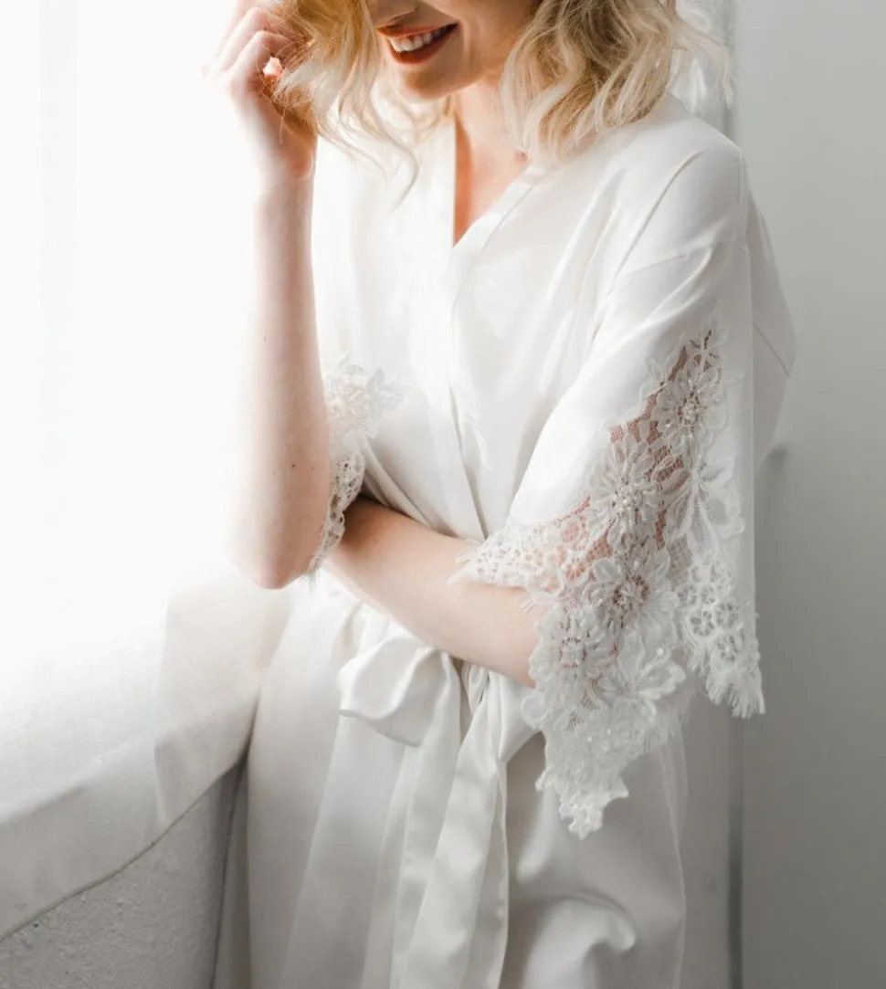 The Emily White Cotton Robe was inspired by what model Emily DiDonato wore on the morning of her wedding. Made of soft Egyptian cotton and brought to life with artfully placed appliqués of delicately beaded Chantilly lace, it is undeniably romantic and feminine. You can be sure this piece will easily transition from your wedding day to your honeymoon destination and beyond.