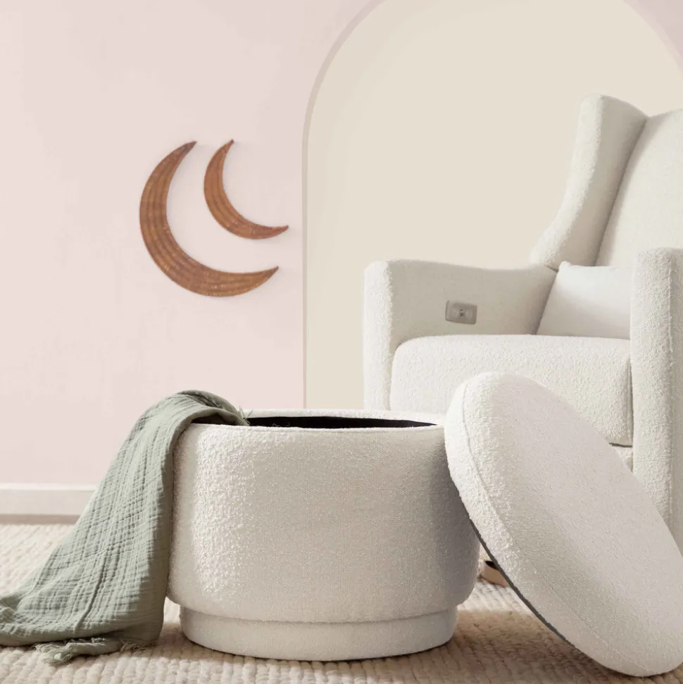 Designed in Los Angeles, babyletto creates stylish, modern nursery furniture with a focus on safety, sustainability, and intuitive design. For over a decade, the brand has empowered parents to craft spaces that reflect their values and individuality. The Enoki Storage Ottoman in Ivory Boucle adds sculptural charm and smart functionality to any space. With its stacked, rounded profile and texture-rich boucle upholstery, this hand-finished piece offers hidden storage and a cozy, modern accent for the nursery or home.