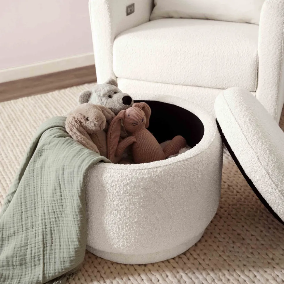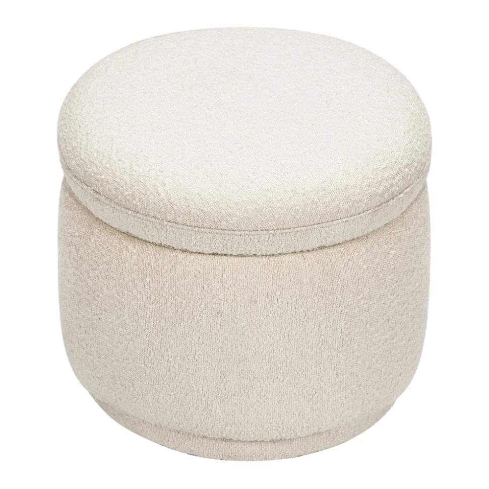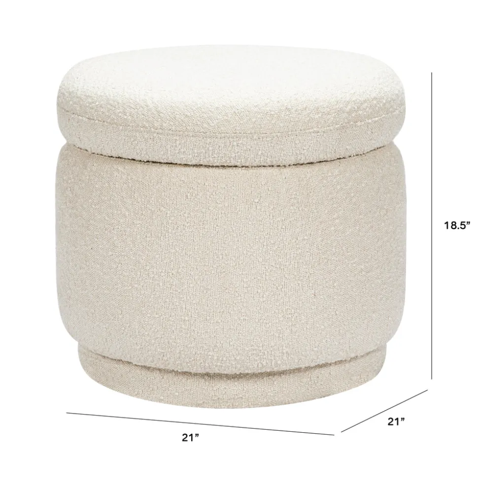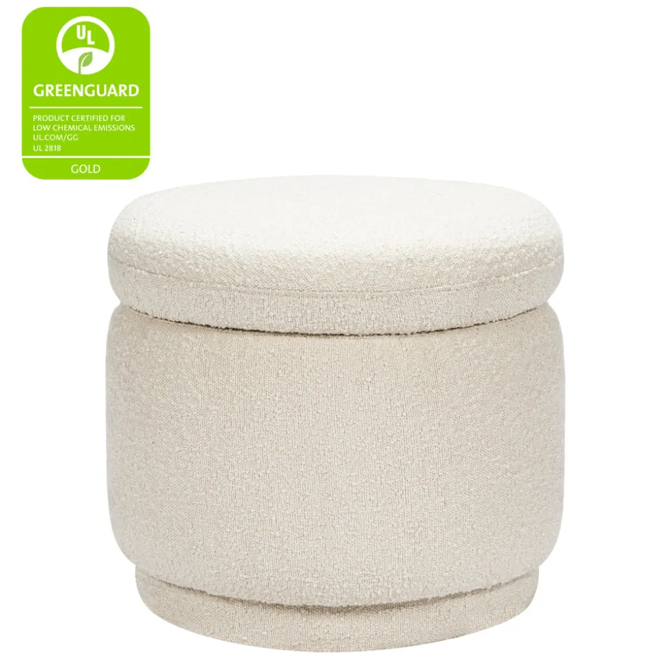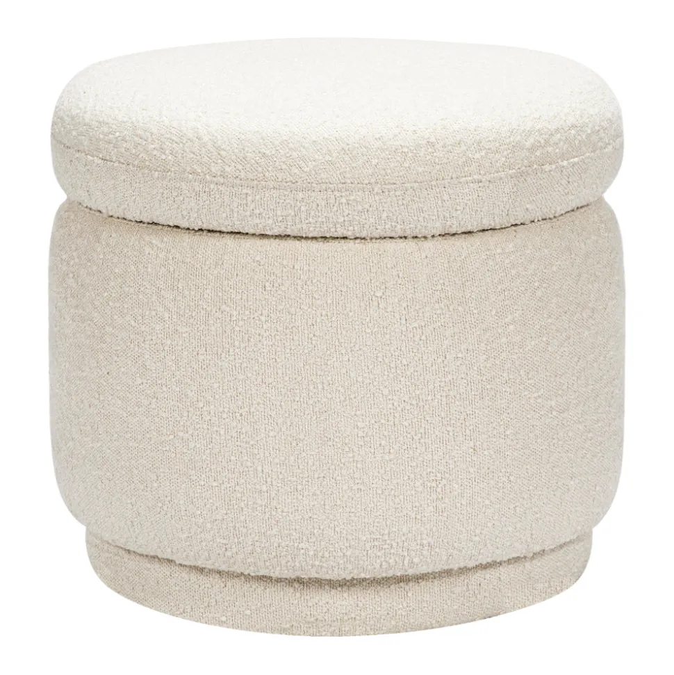 Ivory boucle fabric. GREENGUARD Gold Certified. Upholstered by hand in soft, texture-rich fabric. Spacious interior for storage. Stacked round silhouette with stationary base. Pairs with a variety of nursery seating. Constructed with FSC®-certified wood frame and CertiPUR-US® certified foam. Emissions-tested and free of chemical flame retardants.