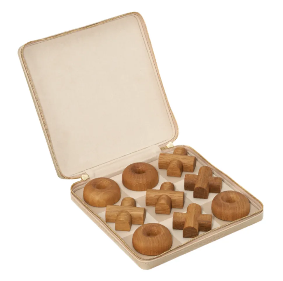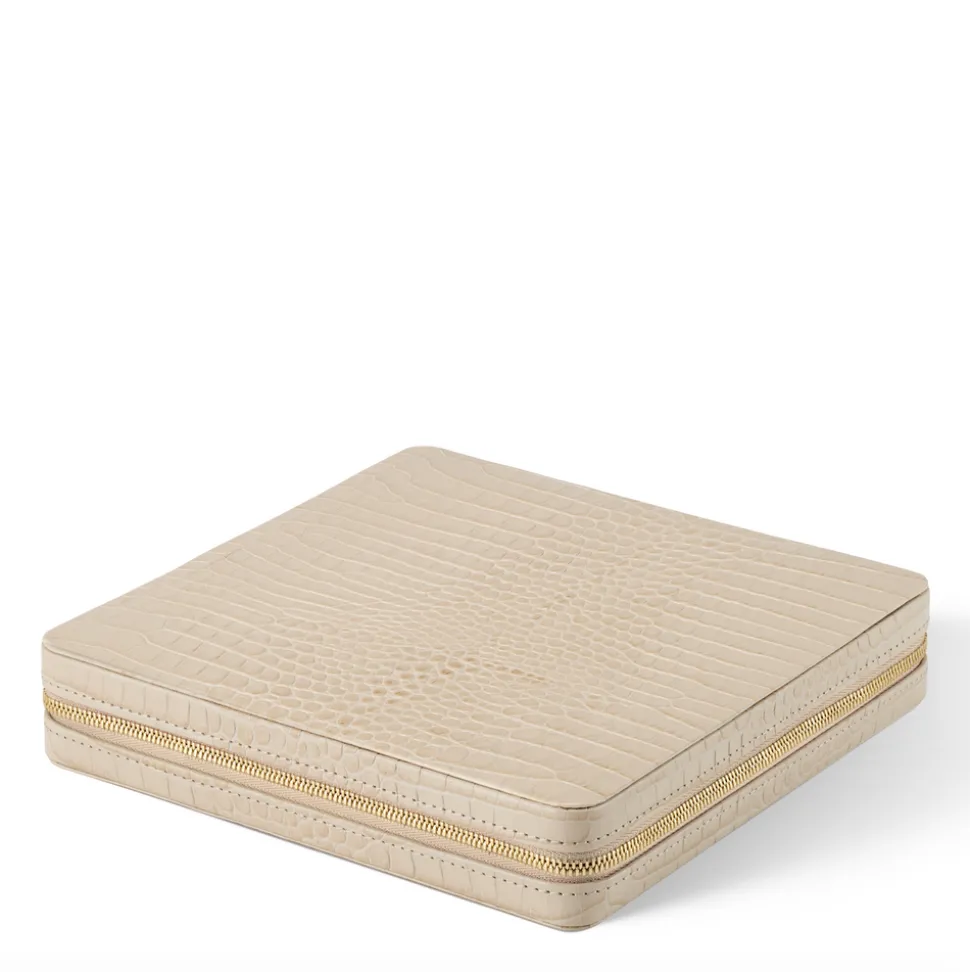 Effortless, beautiful living is what’s important to Aerin Lauder. That ease and refinement shines through in every detail of her collections of beauty products, home decor, and fashion accessories. The Enzo Travel Tic Tac Toe Set conveniently holds a set of O and X pieces in white oak, engraved on the bottom with the AERIN logo, on a leather board. Both the board and pieces are magnetized, while the case, crafted in croc embossed Italian leather with a zipper, is practical enough to include in a carry-on bag when traveling, but attractive enough to place on a coffee table a bookshelf at home.