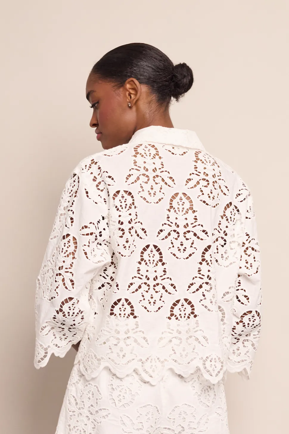 Founded by three New York City-based mothers who met through their kids, Cara Cara’s hallmarks include crisp poplin, house-designed prints, and casual glamour. The inspiration for their ethical womenswear comes from interior design, as well as the world’s most exotic locales. The Erica Shirt in White Embroidered Eyelet features a stunning kimono sleeve with cuffs. The cropped, boxy fit is modern and elegant, and accentuated with decorative scallop detail on the sleeve.