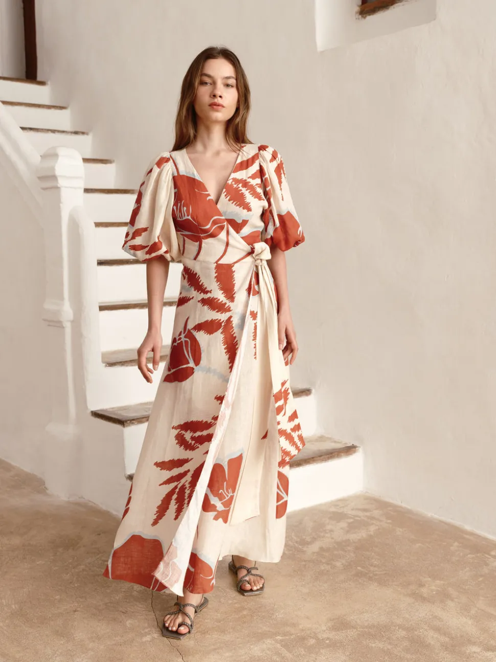 Inspired by Colombia’s magnificent tropical landscapes, Maria Fernanda Valencia built Juan de Dios to not only share that beauty, but give back to the land and its people. Engaging with local artisans, the brand’s consciously crafted swimwear and accessories arrive in unique collections that both flatter and feel amazing. Blending a sense of ease and timelessness, the Ermita Linen Maxi Dress in Ecru & Orange Gladiolos boasts a relaxed fit and chic palm print. Easily dressed up or down, we love the elegant puff sleeves.