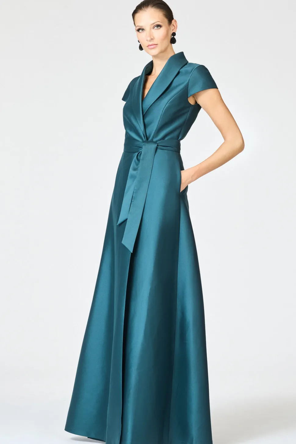 Born in India, Sachin and Babi bonded at New York’s Fashion Institute of Technology and launched an embroidery business, working with top houses, like Oscar de la Renta and Manolo Blahnik. Today, the brand works with their own factory in Mumbai, controlling quality at every stage, and producing womenswear that is at once unique, beautiful, and wearable. The Ettiene Gown in Forest Green is cut from lustrous stretch mikado with a wrap-front bodice, notched collar, and self-tie belt. A-line shaping, subtle volume, and pockets give this polished piece an effortless, modern edge.