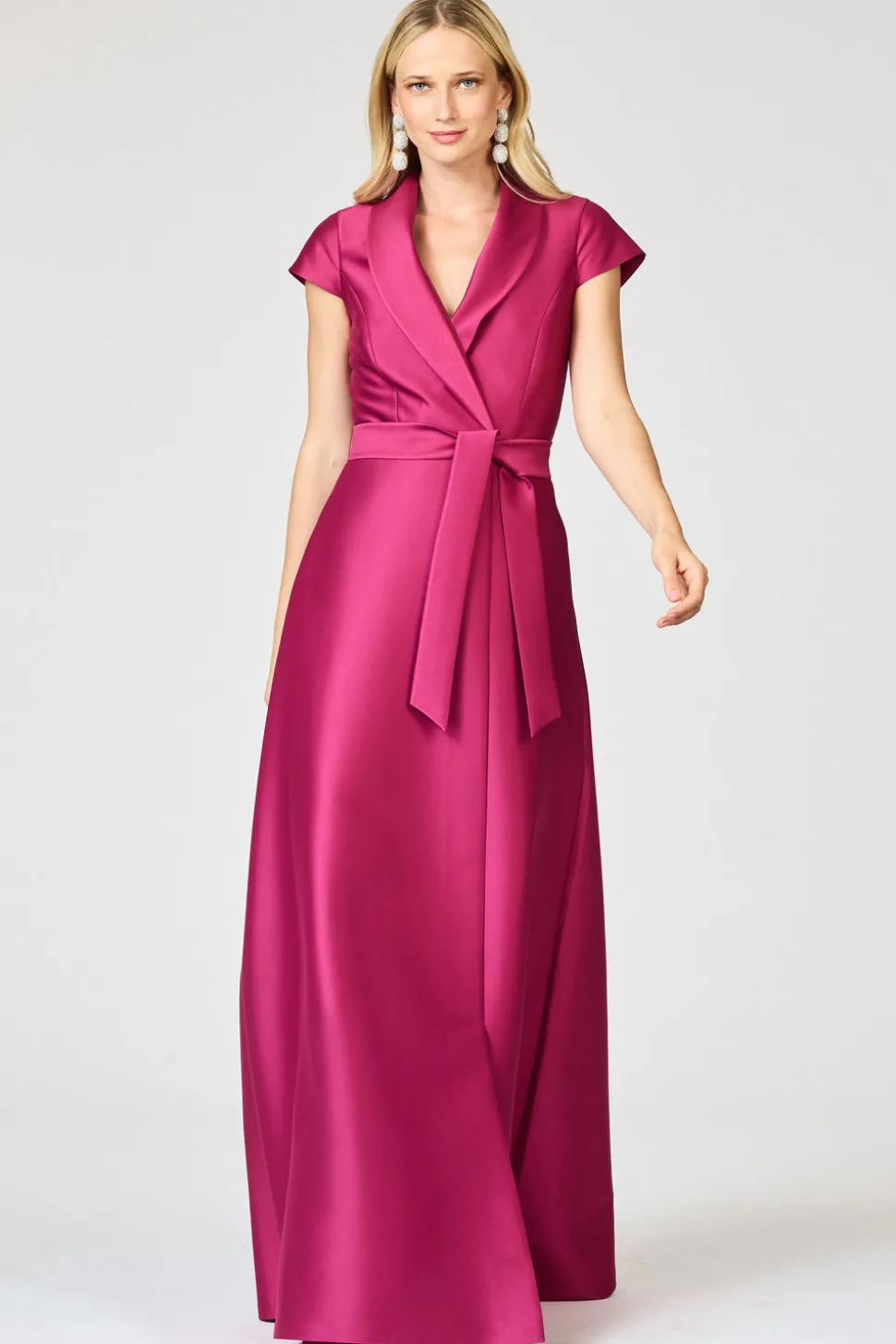 Born in India, Sachin and Babi bonded at New York’s Fashion Institute of Technology and launched an embroidery business, working with top houses, like Oscar de la Renta and Manolo Blahnik. Today, the brand works with their own factory in Mumbai, controlling quality at every stage, and producing womenswear that is at once unique, beautiful, and wearable. The Ettiene Gown in Rhodolite is cut from lustrous stretch mikado with a wrap-front bodice, notched collar, and self-tie belt. A-line shaping, subtle volume, and pockets give this polished piece an effortless, modern edge.