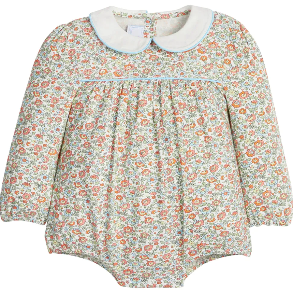 Shannon Latham founded Little English in 2004 with the belief that children should always be well-dressed. Employing hand-smocking, hand-embroidery, and the very best fabrics, Shannon and her daughter design timeless pieces that will be worn for generations to come. The Evelyn Bubble in James Floral showcases a bright, cheerful pattern in shades of blue, orange, and yellow, accented by sky blue piping across the chest and on the Peter Pan collar. Crafted from soft knit, this classic bubble style offers comfortable playwear and coordinates beautifully with the Evelyn Dress in the same print for sibling sets.