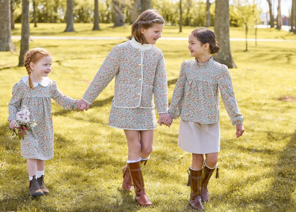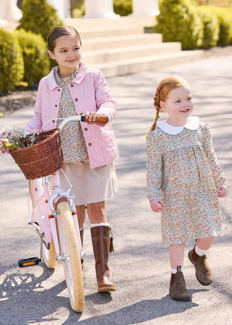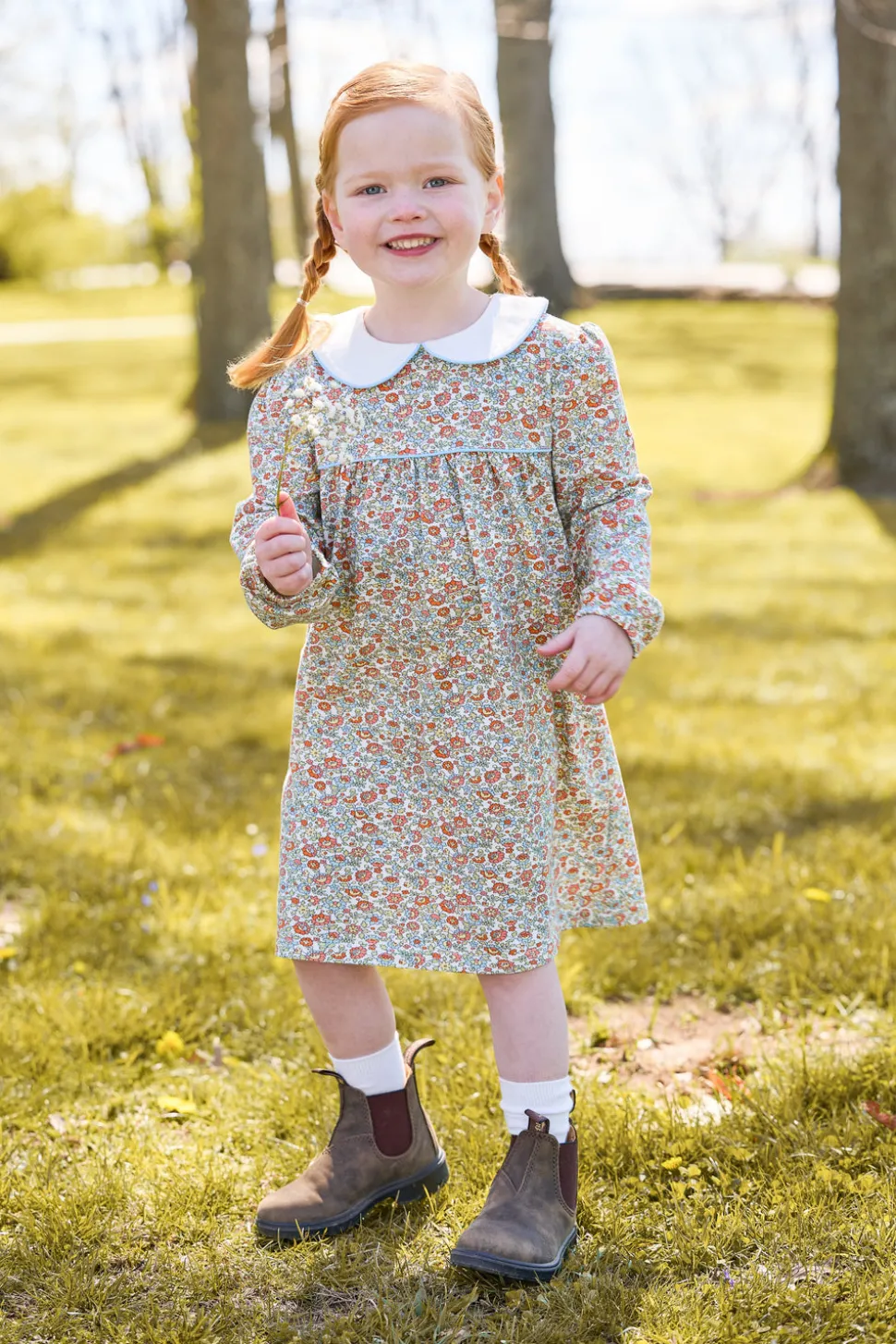 Shannon Latham founded Little English in 2004 with the belief that children should always be well-dressed. Employing hand-smocking, hand-embroidery, and the very best fabrics, Shannon and her daughter design timeless pieces that will be worn for generations to come. The Evelyn Dress in James Floral features a bright, cheerful pattern in shades of blue, orange, and yellow, enhanced by sky blue piping across the chest and on the Peter Pan collar. Crafted from soft knit, this classic style offers comfortable wear for play and pairs beautifully with the Evelyn Bubble in the same print for sibling sets.
