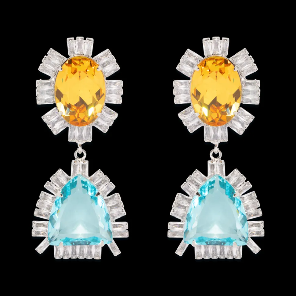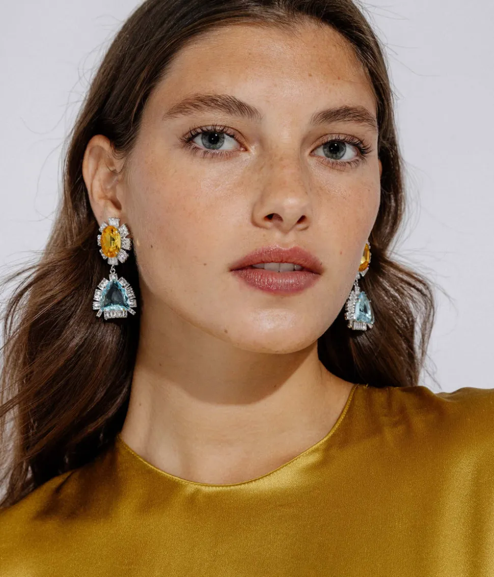 Loren Barham founded her jewelry line in 2005 as a means to reconnect with the vintage jewels that inspired her as a child. Today, the dynamic, artistic, original pieces of Loren Hope, designed at their flagship store in Newport, Rhode Island, serve as a bridge between nostalgia and thoroughly modern women everywhere. Classic and colorful, the Everett Drop Earrings are a quintessential collection piece. The two-stone drops feature sparkling aqua and light topaz crystals flanked by sparkling baguettes. While scaled down in size but not in glamour, this style works equally well for wedding guest attire or a cozy sweater dress.
