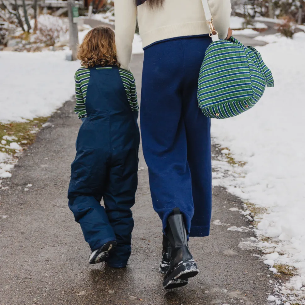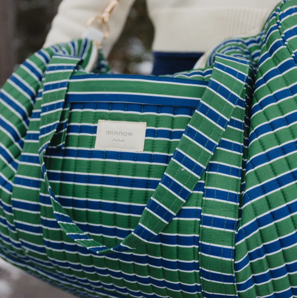 A family favorite for its clean lines and simple details, minnow creates pieces that are playful, polished, and thoughtfully designed for long days, sandy toes, and the wonderment of life on the shore. The Evergreen Stripe Weekender Bag is your new go-everywhere bag. It is the ideal size, roomy enough for all your essentials, but not overly bulky. With two grab handles and a long shoulder strap, you have plenty of options for carrying it across the sand or the airport. Interior and exterior pockets allow for safe storage of smaller items. Gold zippers and hardware add a touch of sophistication to the tasteful simplicity of this chic print.