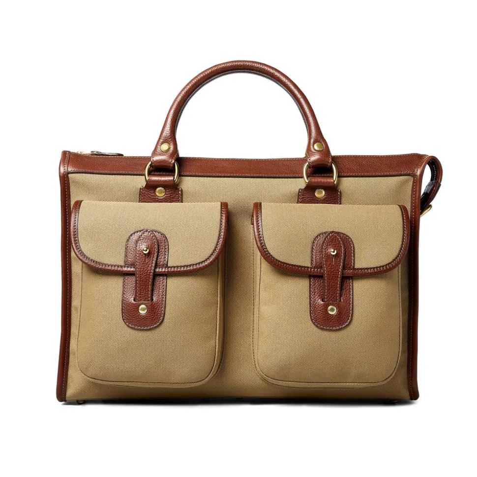 From the office to train’s quiet car, the Examiner No. 5 in Khaki Twill – Vintage Chestnut is an ideal choice for the modern-day professional. Fesigned with classic lines and features two exterior flap pockets with signature brass point and leather tab closures, it boasts elegance at its most understated. Bonus: the rear exterior open pocket fits a newspaper or small umbrella and the interior laptop sleeve can fit up to a 15″ laptop.
