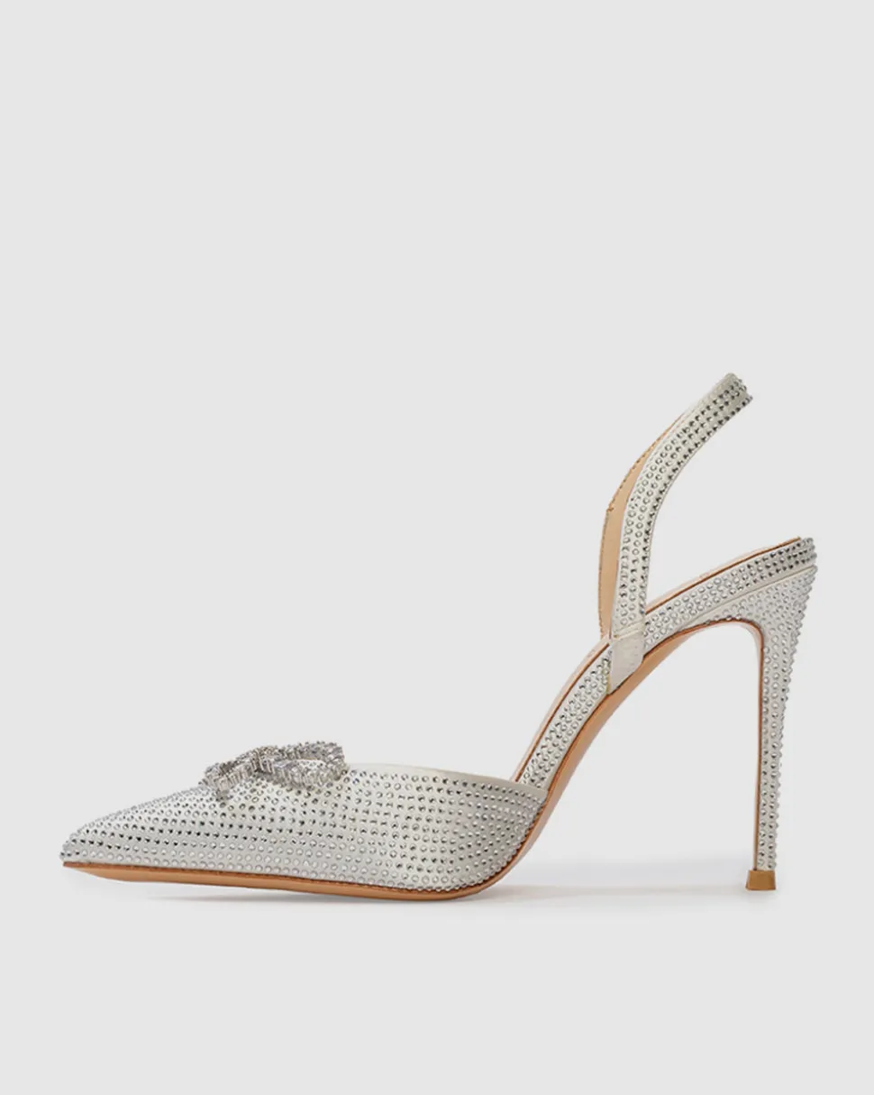 Founded by Kris Avakia in Montréal, Black Suede Studio fuses heritage, passion, and fine craftsmanship to form a line of forward-thinking, luxury footwear. A pointy toe sling back pump with crystal embellished bow ornament, set on a stiletto pin heel, the Extra 100 in White Satin Embellished is crafted in a satin crepe for sophistication in every step.