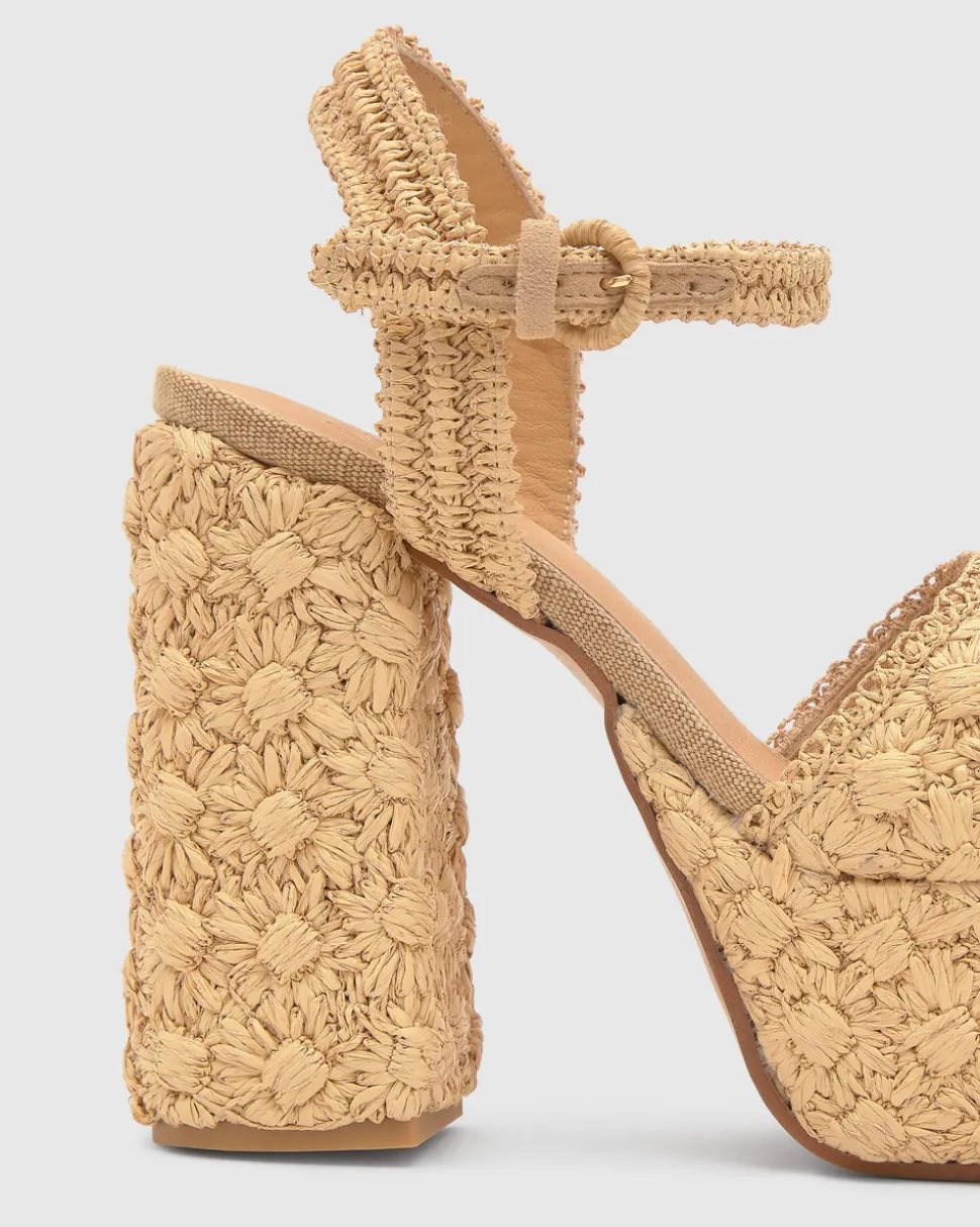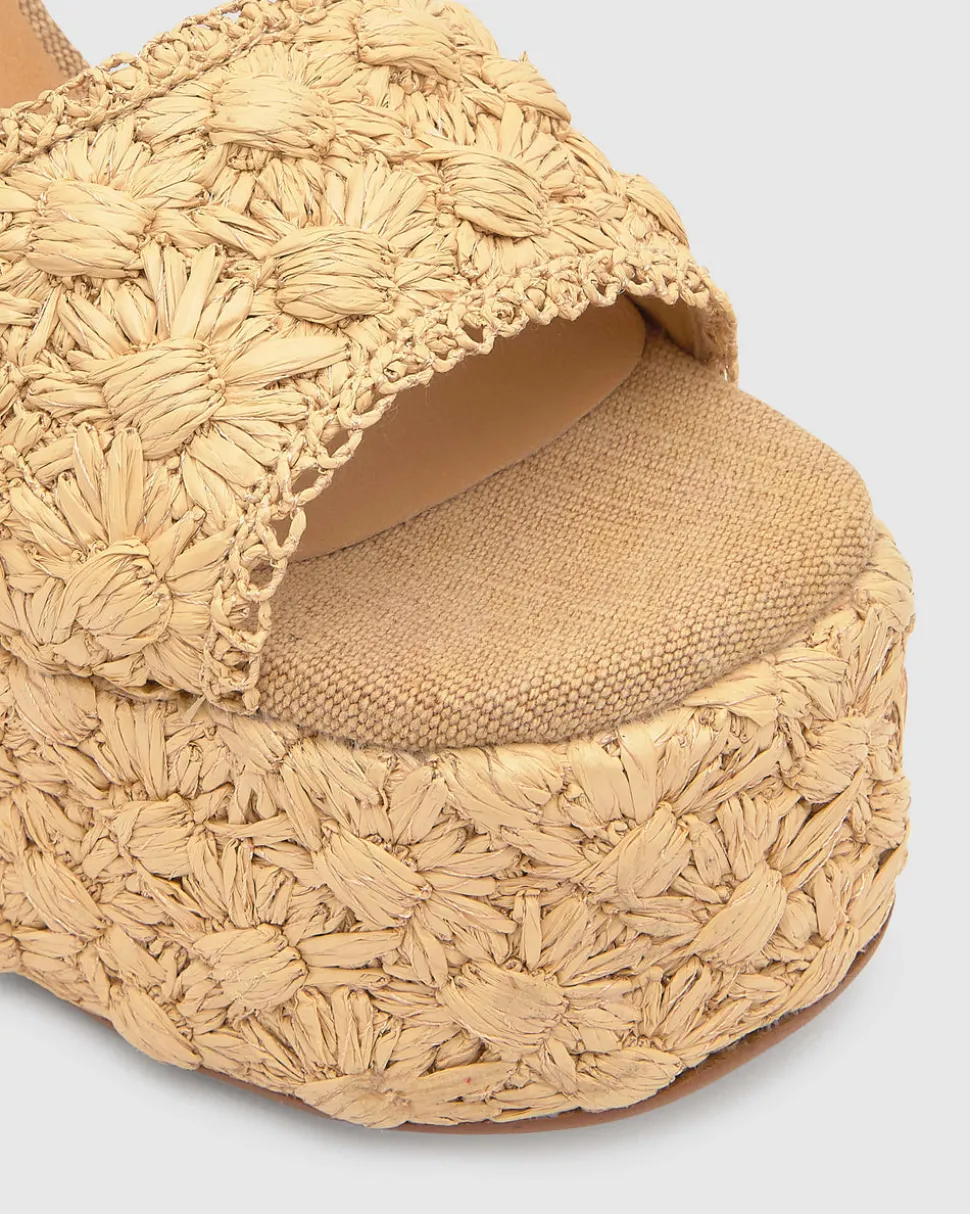 99% raffia polyetheline, 1% sheep leather. Sandal. 5.12″ heel.