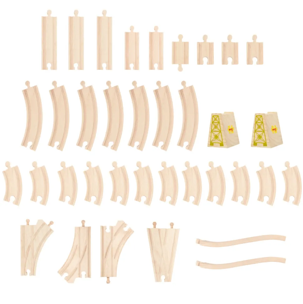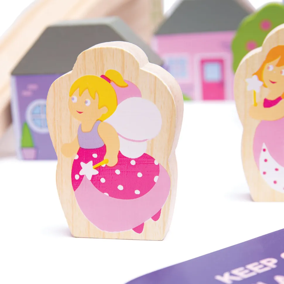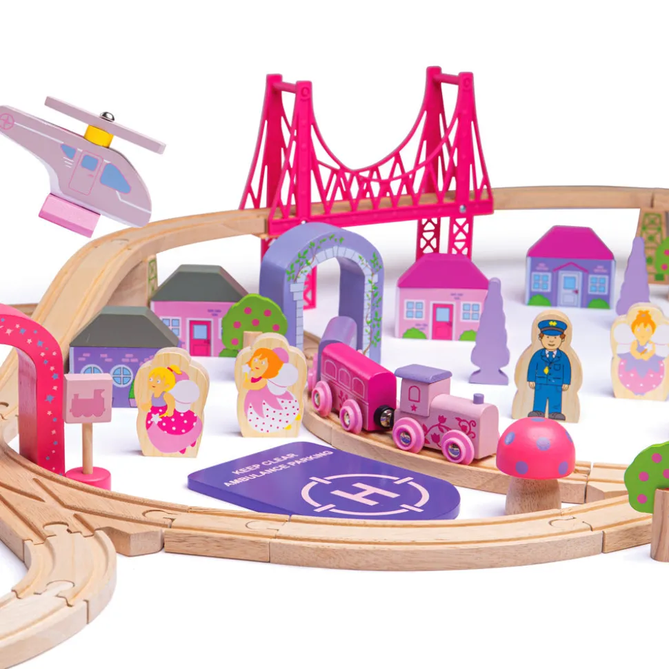 75 piece set. Wooden train track including curves, straights and a bridge, pink bridge and pastel engine shed, pink helicopter and purple helipad, 1 train engine, 2 carriages, trees and houses, fairies, 2 magical toadstools. Crafted from 100% FSC Certified materials that have been sustainably harvested from FSC forests. Age: 3+ years.