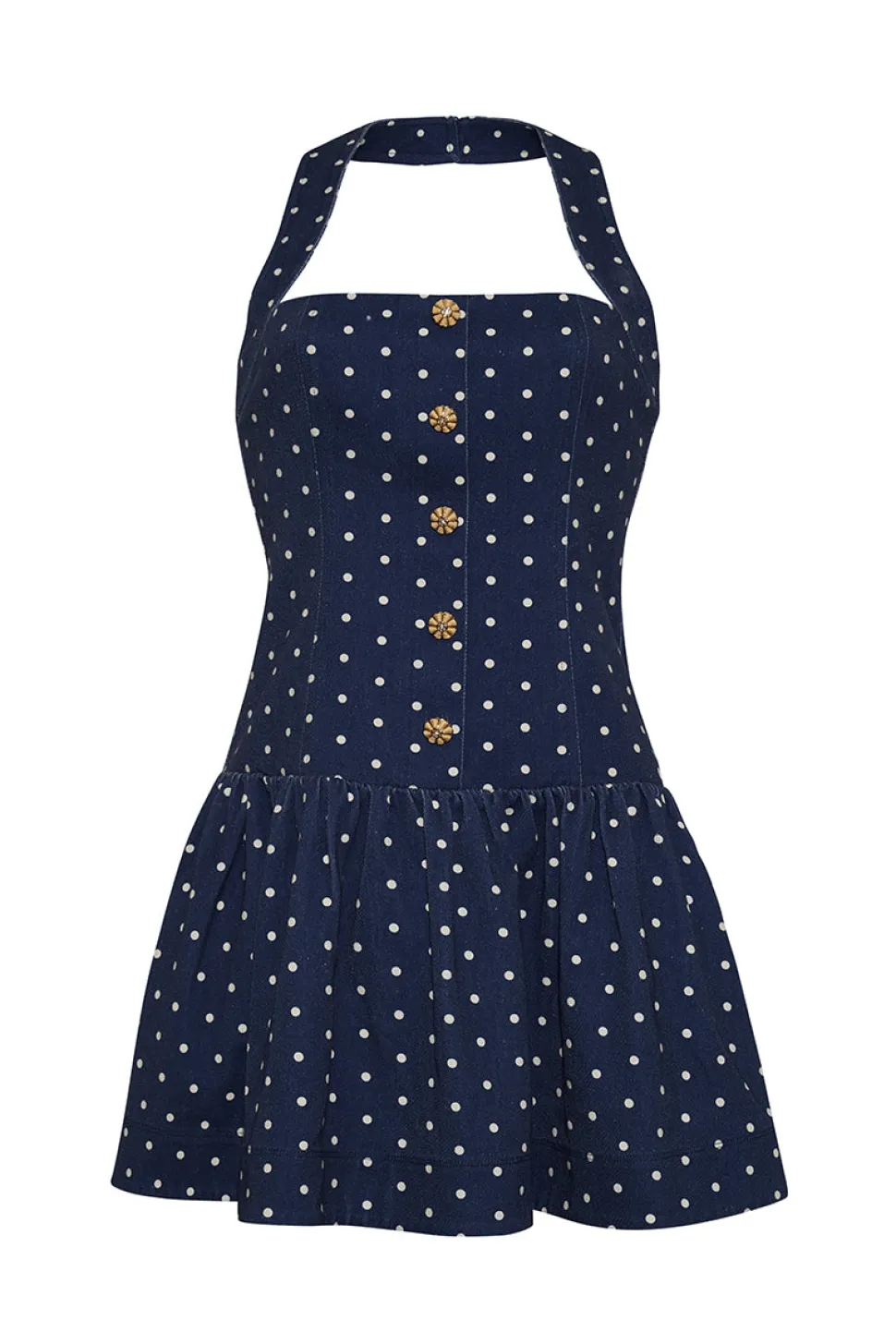 Founded by three New York City-based mothers who met through their kids, Cara Cara’s hallmarks include crisp poplin, house-designed prints, and casual glamour. The inspiration for their ethical womenswear comes from interior design, as well as the world’s most exotic locales. The Felicity Mini Dress in Dots Navy is a fresh take on flirty sophistication. A halter neckline and square-cut bodice offer a refined frame for the playful mini silhouette, while raffia buttons and allover topstitching lend artisanal texture. Equal parts charming and polished, it’s a standout for sunny days and warm evenings alike.