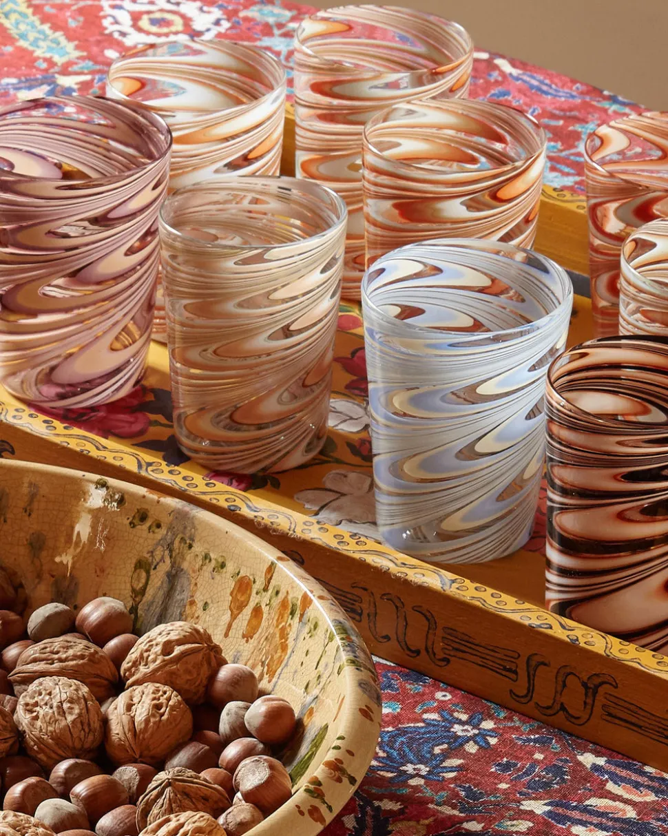 Inspired by the pages of Cabana—a magazine for a new generation of globetrotters—Casa Cabana’s homewares both explore and expand the worlds we share with our interiors. Designed in-house and hand crafted by artisans the world over, each piece feels unique, collectible, and at once part of your home. The Fenicio Glass in Lilac is hand-blown on Murano, the historic Venetian glassmaking island. Produced in collaboration with Laguna~B, these glasses feature an extraordinary marbled pattern that combines traditional artisanship with contemporary innovation.