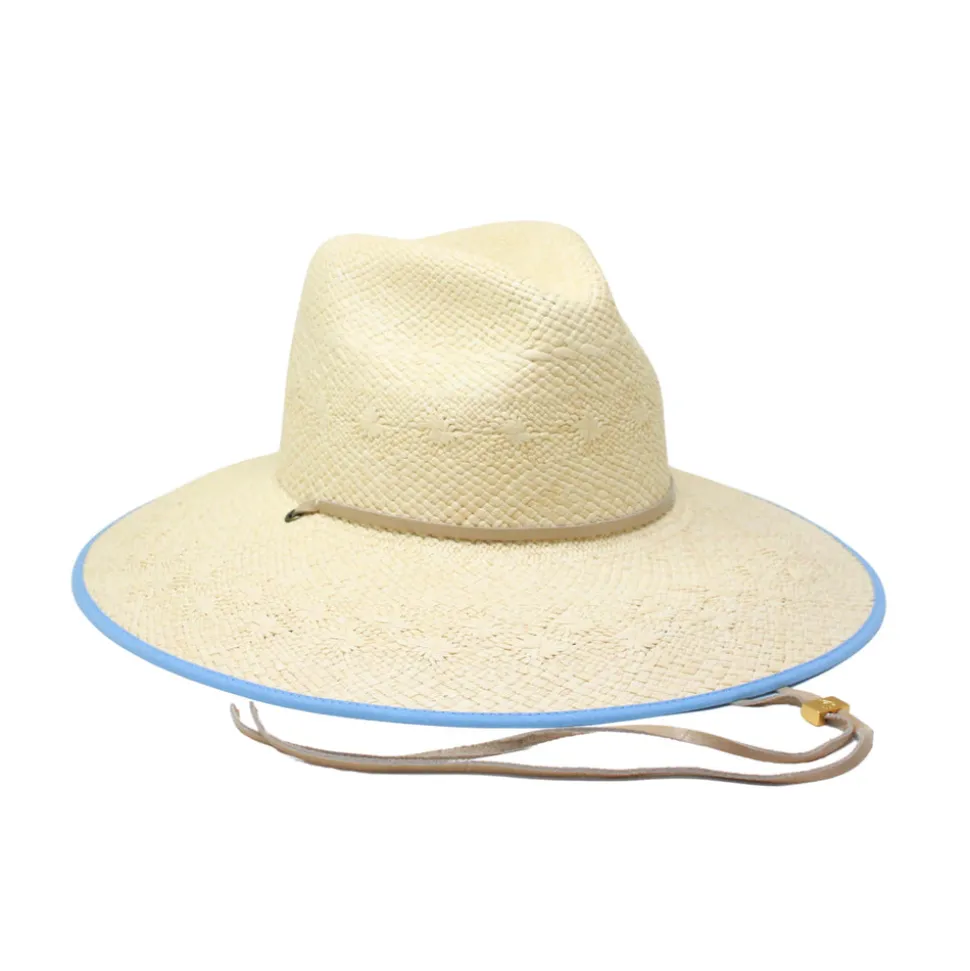 Founded, owned, and operated by women, Freya redefines the Panama hat with modernized silhouettes, UPF 50+ coverage, and organic materials. Embracing 3000 years of tradition, each piece is handcrafted with toquilla palm plant fibers by artisans in Northern Ecuador, and designed with a contemporary eye, resulting in stylish, versatile pieces made to last a lifetime. A luxe remix of the traditional lifeguard hat, the Fiji Hat in Natural & Sky is designed with an intricate woven pattern, a broad brim for sun protection, and a supple leather chin strap for a refined yet relaxed finish.