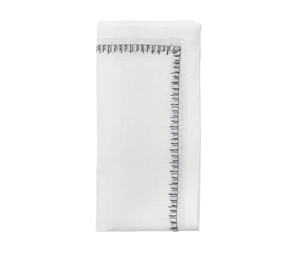 Kim Seybert designs artisan-made tabletop decor and luxury home accessories. Create a well-dressed dining look with the brand’s range of elegant tableware, placemats, runners, chargers, plates, napkins, flatware, and more. A fresh take on the classic white napkin, the Filament Napkin in White, Silver & Gunmetal, Set of 4 features long, floating embroidered stitching. These long stitches are reminiscent of the filaments in the center of a lightbulb. This best-selling style is available in different colored embroidery to suit many different dining themes.