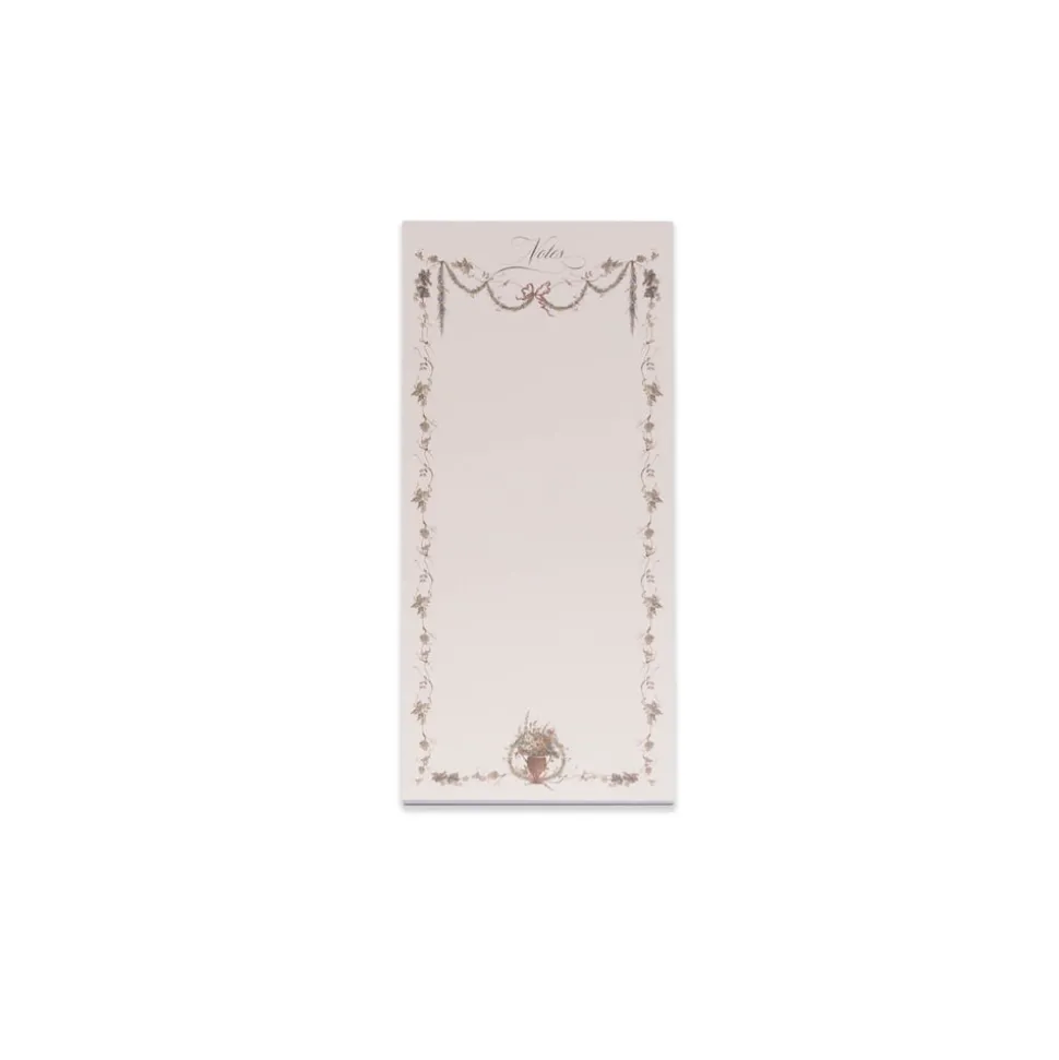 Imbued with romantic imagery and sumptuous patterns, Nadia & Co. creates beautiful products that turn little moments into decadent memories. Toronto-based artist and tastemaker, Nadia Colella, has perfected her craft with over fifteen years of industry experience. Bordered by enchanting garland and vine-like motifs with bow accents, this slim notepad features 50 tear-off sheets. Jot down your to-do list or leave a sweet message to a loved one on the charming paper.