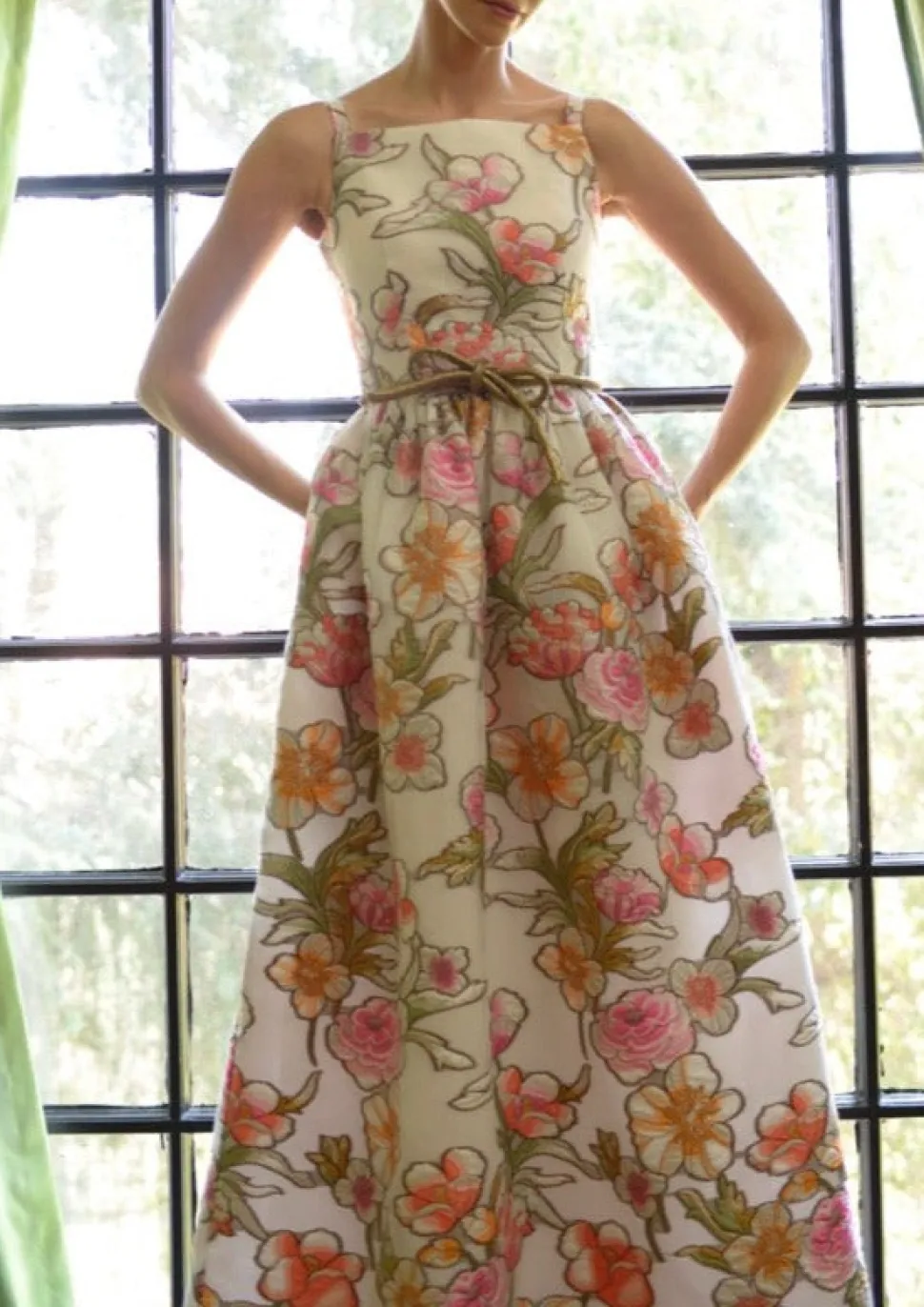 Known for using exquisite textiles from the finest European mills, Barbara Tfank’s collections are classic and timeless in French brocades, Italian silks, intricate jacquards, and more. Endlessly romantic, the Dirndl Skirt Gown is a fit-and-flare dress that features embroidered floral organza, and a stunning pink, green, and gold French brocade. A showstopper in any setting, and as graceful as it is sublime.