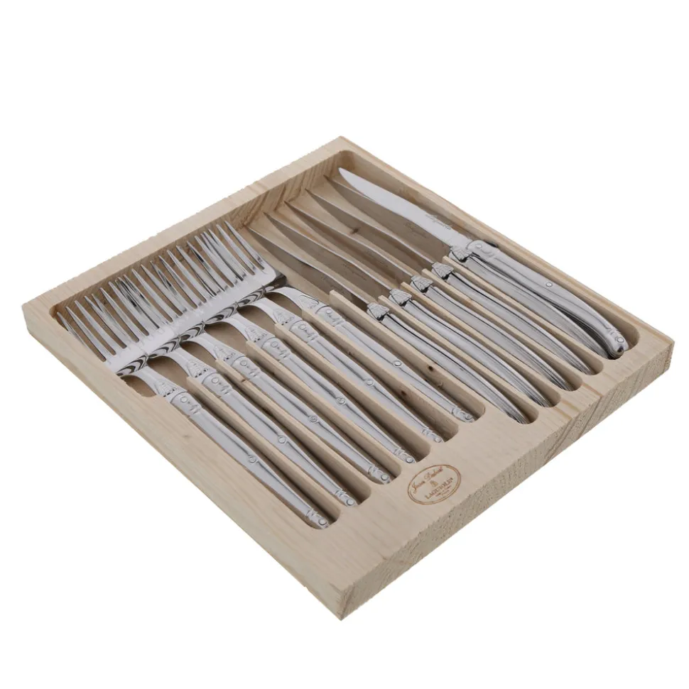 The Jean Dubost family has crafted renowned, high-quality artisan knives since 1920. Trusted in kitchens and restaurants throughout France, the legendary Laguiole tradition has now gone global. The Laguiole mark has expanded to include flatware, wine waiters, and cutlery crafted with the same quality and craftsmanship. The Flatware Set, Set of 12 is an ideal addition to any kitchen, or dining room. Any guest will raise their eyebrows at the divine craftsmanship and sturdy, elegant design found in every knife and fork. It doesn’t get any finer.