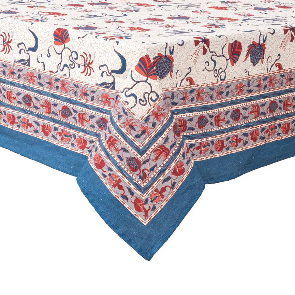 Idyllic landscapes, sumptuous colors, and the vibrant beauty of Southern France describes Couleur Nature. This brand of hand-painted table linens aims to bring a Provençal sense of effortlessness, rich culture, and joie de vivre to your life and home—no matter where you live. The rich harvest tones of the Fleur des Indes Tablecloth in Blue & Red collection compliments its curling vines and exotic floral designs, adding a sense of natural splendor to any meal Suitable for formal, festive, and casual events alike, this high-quality linen features Eastern motifs with classic French country styling, and has been handprinted by skilled artisans using a time-honored technique.
