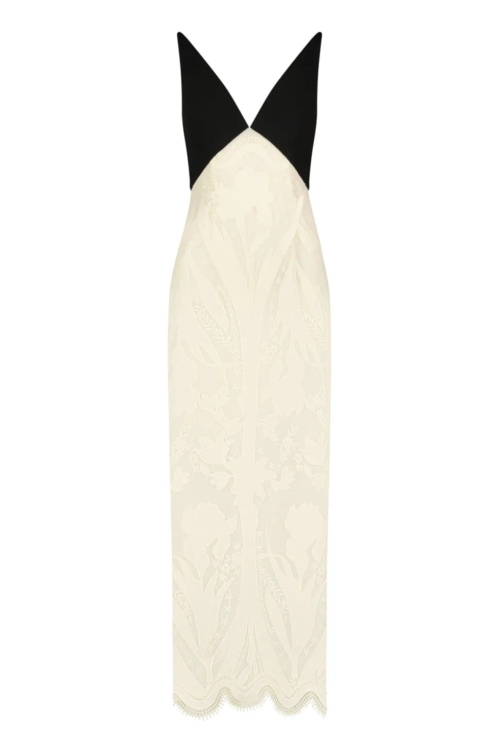 New York City–based Lela Rose employs a brilliant use of color, rich fabrications, and handcrafted detail in her bridal and ready-to-wear looks. These designs have been worn by the likes of First Lady Michelle Obama, Gwyneth Paltrow, Selena Gomez, and sophisticated women around the world. Crafted in a combination of exquisite embroidered tulle and draped crepe, this rich Floral Embroidered Tulle V Neck Sheath Dress in Black & Ivory features a slinky plunge v neck paired with stunning Western-Victorian inspired floral embroidered overlay. Organic nouveau botanicals are paired with embroidery motifs inspired by a shawl in the Georgia O’Keeffe archives, contrasting with the sheer counterpane and finished with a fully lined underlayer. A statement stunner.
