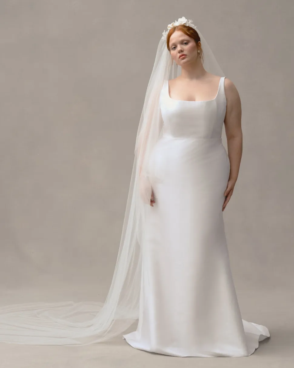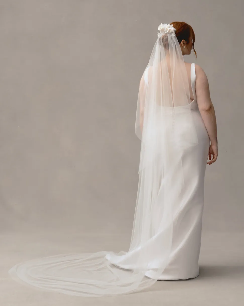 Famed for their comfort and wearability, Alexandra Grecco’s gowns and accessories find the balance between what is stylish and what is timeless. Handmade in New York’s garment district, these pieces embrace refinement and luxury from their graceful silhouettes to each immaculate detail. Very romantic, the Florence Veil boasts a flower cluster that frames itself as an appliqué to the top of the cascade shaped veil. Comb is attached to secure in place.