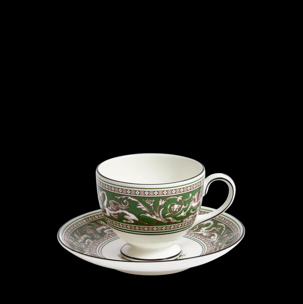 For over 260 years, Wedgwood has produced timeless, eclectic stoneware and china that has graced the tabletops of kings, queens, and some of the finest dining rooms in the world. From its factory in Barlaston, England, the brand’s signature dishware and household items are thrown, modeled, and decorated by artisans who spend a lifetime mastering their craft. First introduced in 1931, the Florentine collection has mythical creatures roaming amidst fantastic flora in delicately hand-rendered motifs set against the clarity of white, fine bone china. The Florentine Verde Teacup & Saucer Set is ideal for your tea service, or serving coffee after dinner.