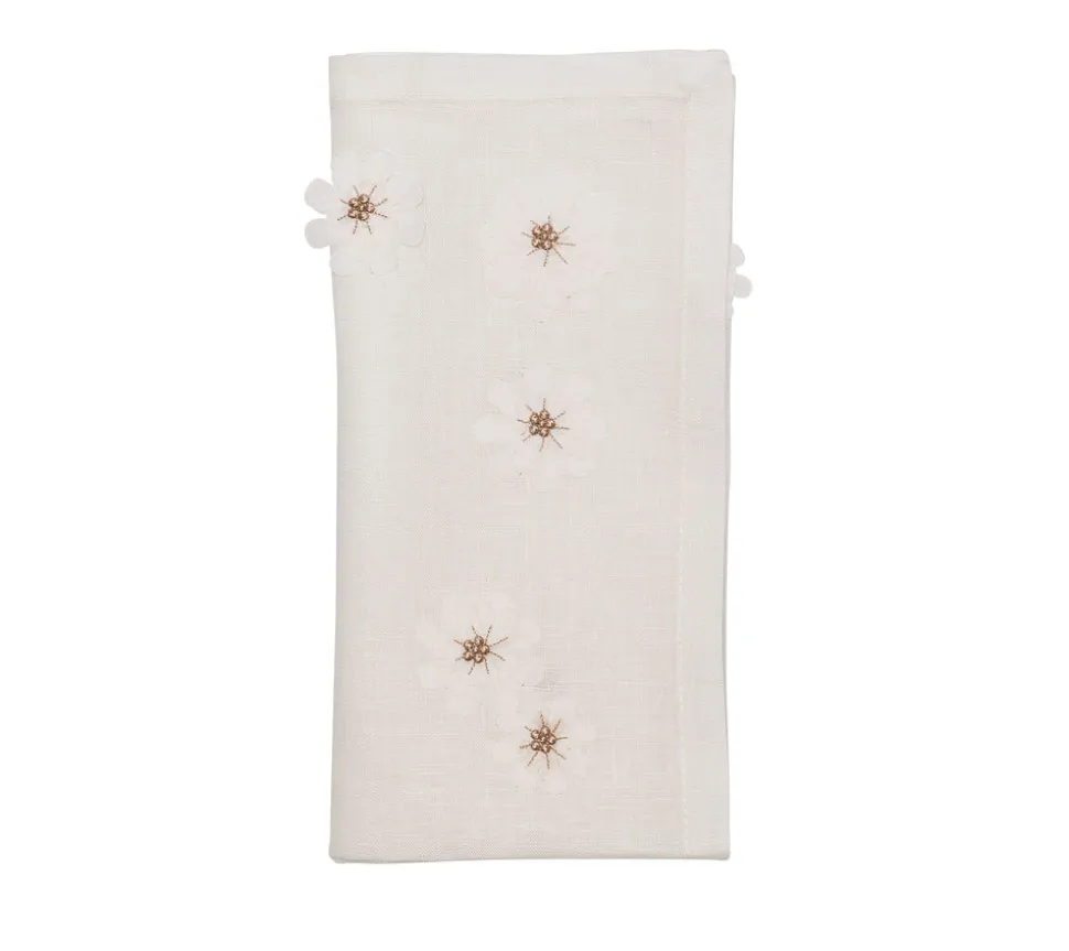 Kim Seybert designs artisan-made tabletop decor and luxury home accessories. Create a well-dressed dining look with the brand’s range of elegant tableware, placemats, runners, chargers, plates, napkins, flatware, and more. The Florette Napkin in White & Natural, Set of 4 instantly transports guests to happy occasions with its three-dimensional floral appliques. The white linen napkin serves as a pristine backdrop for white petal flowers with gold centers. This napkin works well for for spring luncheons, as well as bridal festivities.