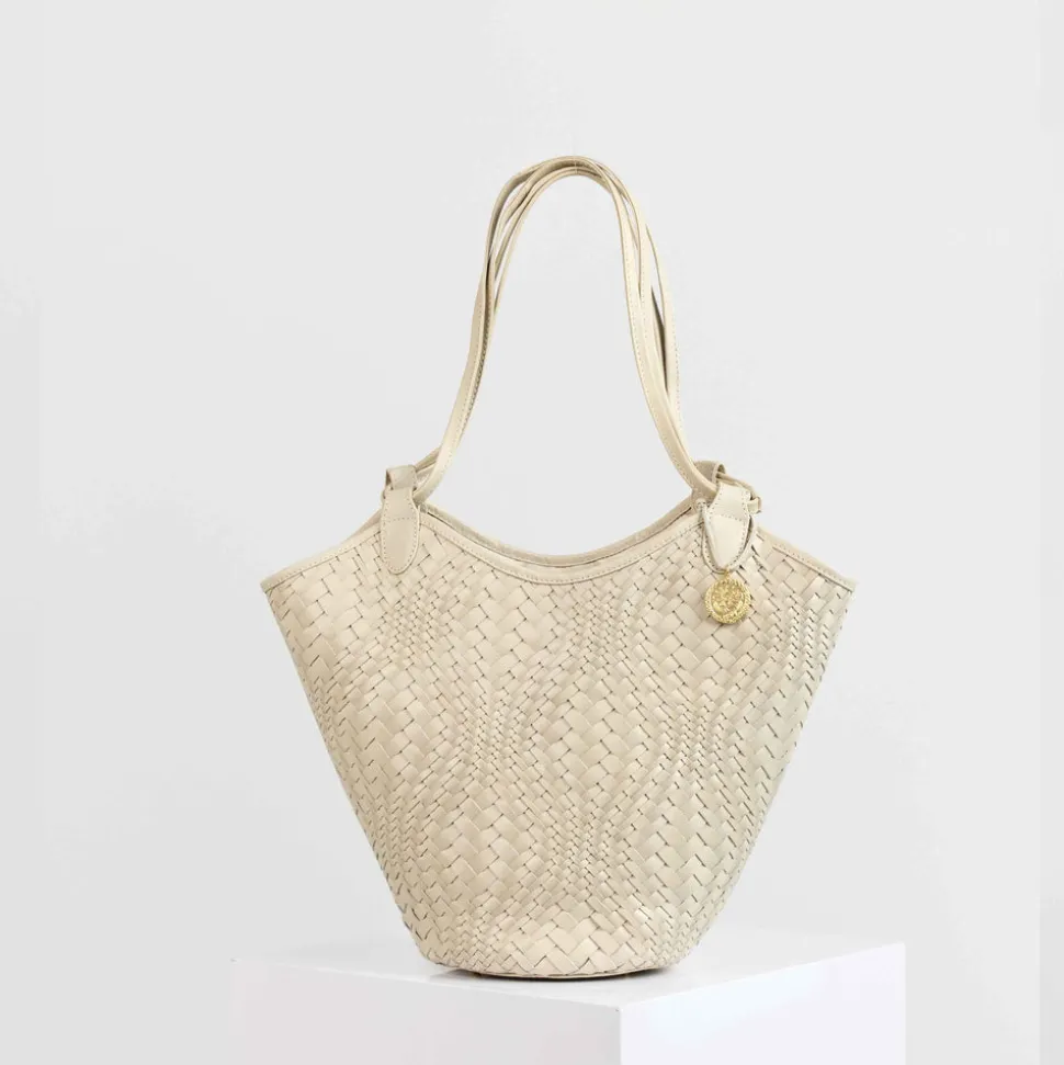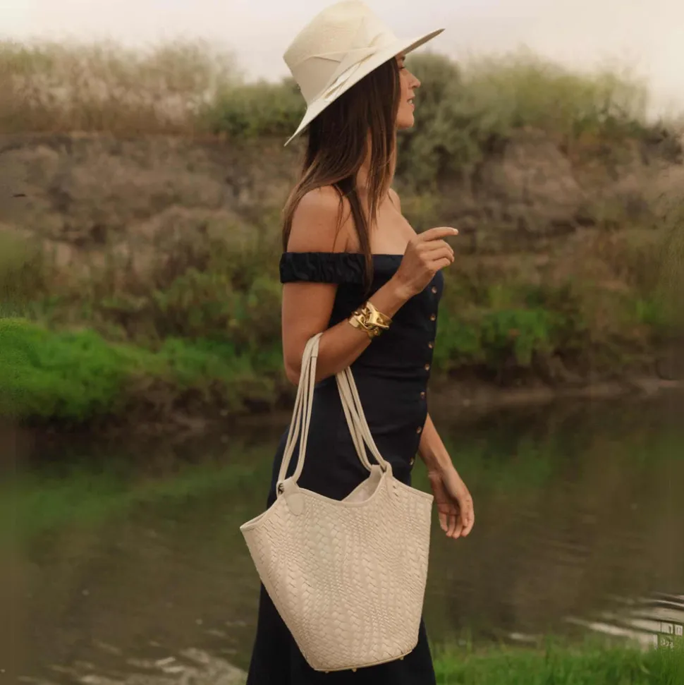 Founded, owned, and operated by women, Freya redefines the Panama hat with modernized silhouettes, UPF 50+ coverage, and organic materials. Embracing 3000 years of tradition, each piece is handcrafted with toquilla palm plant fibers by artisans in Northern Ecuador, and designed with a contemporary eye, resulting in stylish, versatile pieces made to last a lifetime. The Flow Midi Handbag showcases handwoven leather in a wavy, asymmetrical pattern that adds movement and modernity to a timeless silhouette. Lined in soft microsuede and grounded with four brass feet, it’s handmade in India by artisans.