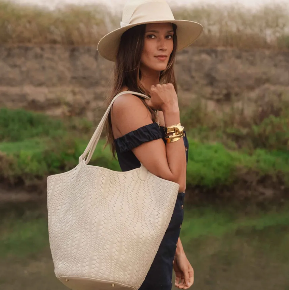 Founded, owned, and operated by women, Freya redefines the Panama hat with modernized silhouettes, UPF 50+ coverage, and organic materials. Embracing 3000 years of tradition, each piece is handcrafted with toquilla palm plant fibers by artisans in Northern Ecuador, and designed with a contemporary eye, resulting in stylish, versatile pieces made to last a lifetime. The Flow Woven Large Tote makes a bold statement with its handwoven leather construction and wavy, asymmetrical design. Lined in soft microsuede and finished with four brass feet, this artisan-made piece from India is part of a three-size collection—tote, handbag, and crossbody—that offers styling versatility.