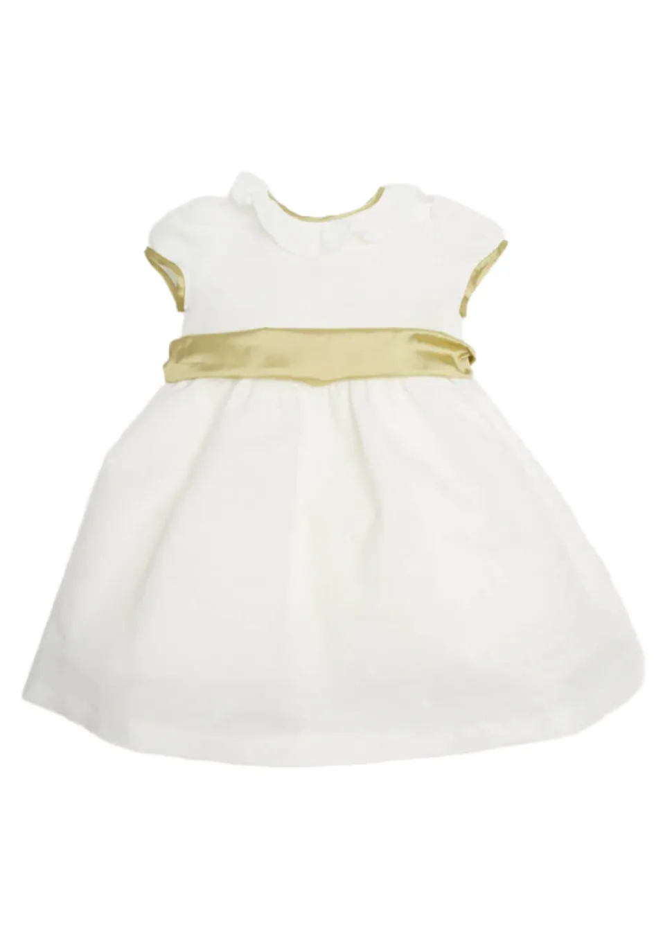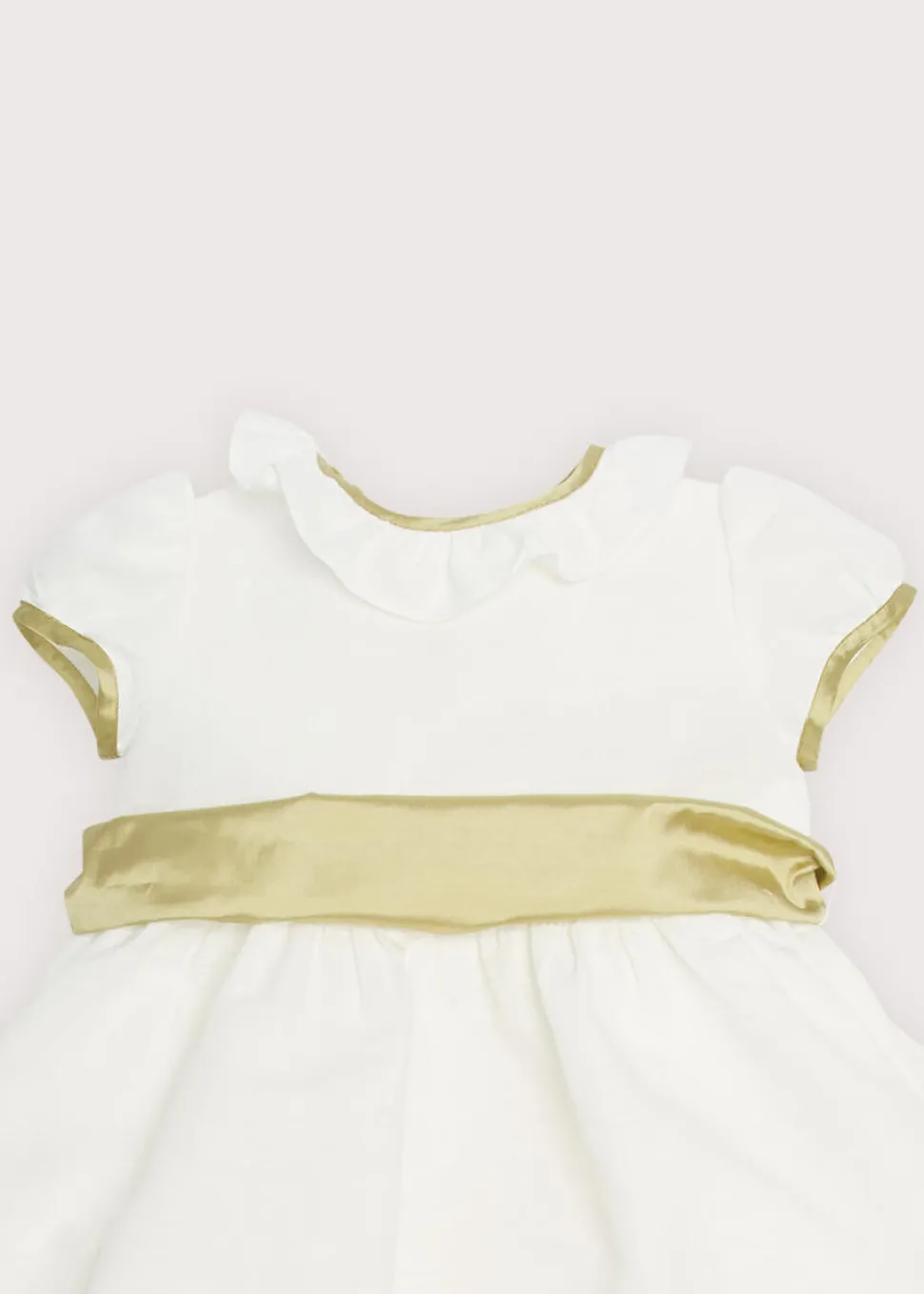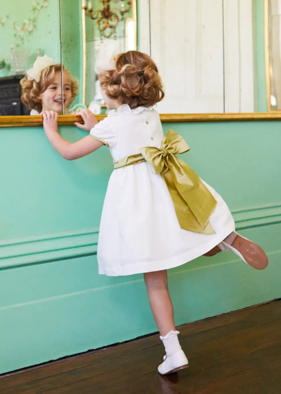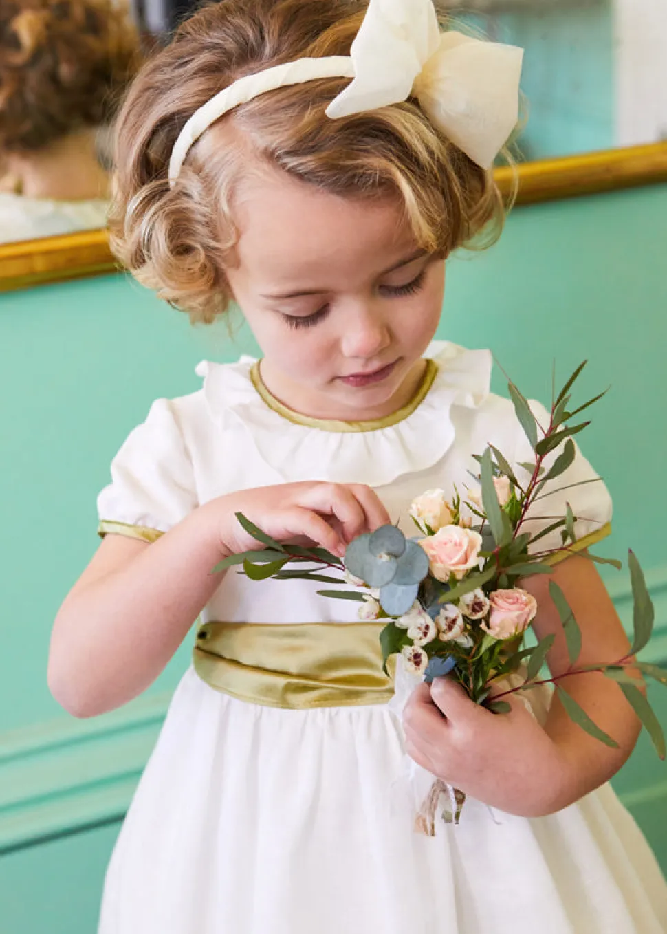 Renowned for exceptional craftsmanship and timeless design, Pepa London creates traditional childrenswear to be treasured and passed down. Each piece reflects the brand’s belief in dressing children like children, combining British style with refined details, comfort, and enduring elegance. The Flower Girl Dress in Ivory with Green Silk Sash features short puffed sleeves, a frill collar, and soft green silk trims. With a voluminous skirt supported by petticoats and a sash that ties into a bow at the waist, this elegant silhouette is ideal for weddings and special celebrations.