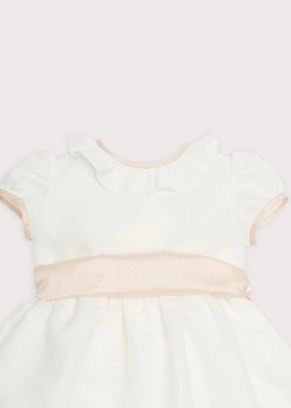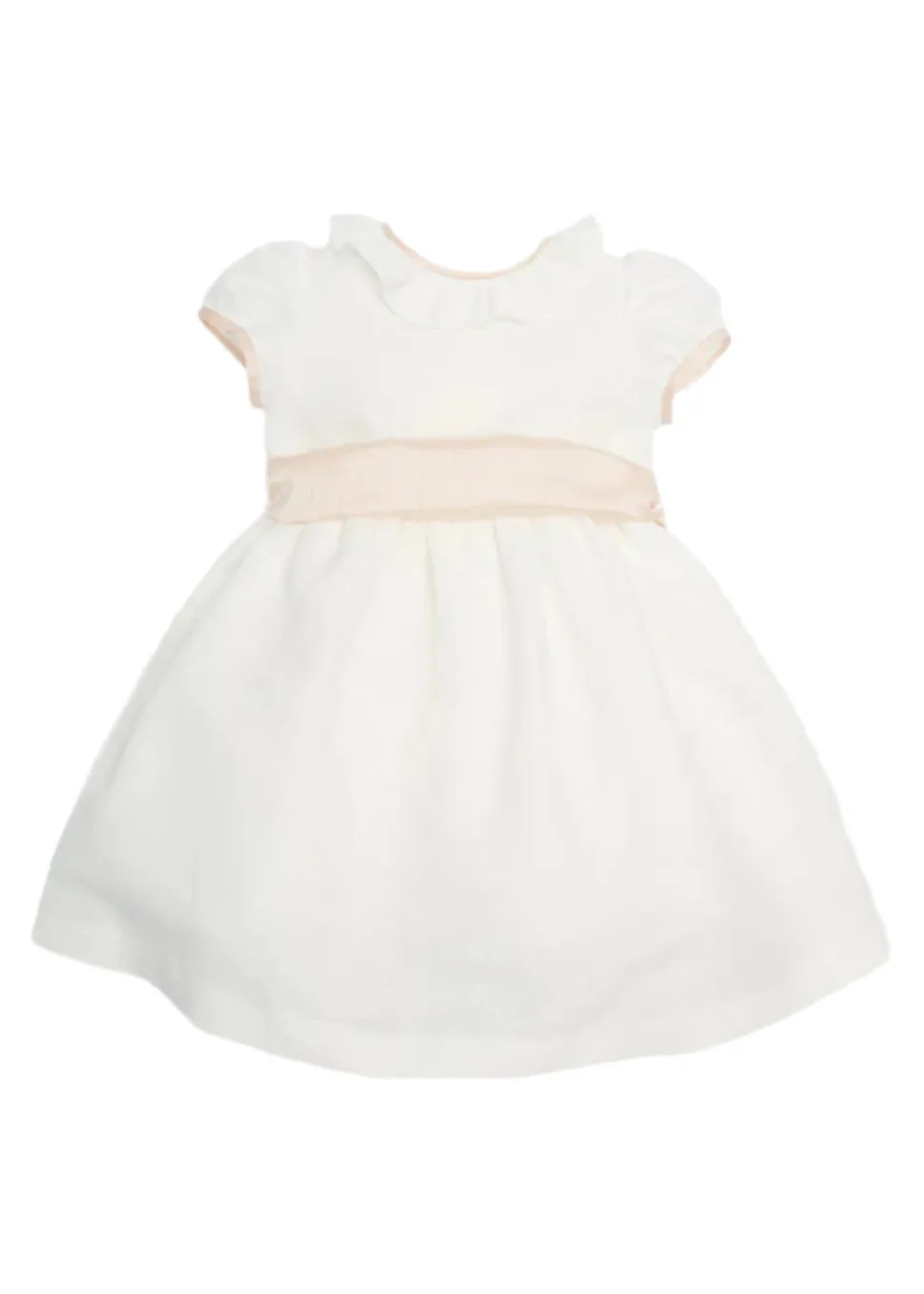 Renowned for exceptional craftsmanship and timeless design, Pepa London creates traditional childrenswear to be treasured and passed down. Each piece reflects the brand’s belief in dressing children like children, combining British style with refined details, comfort, and enduring elegance. The Flower Girl Dress in Ivory with Pink Silk Sash features soft puffed sleeves, a frill collar, and delicate pink silk trims. With a full skirt enhanced by petticoats and a sash that ties in a bow at the waist, this romantic silhouette is ideal for flower girls and special occasions.