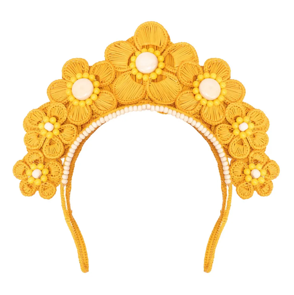 Magnetic Midnight is an evening and special occasion accessories brand by designer Lucia Echavarría. Echavarria’s distinct headbands, bags, and accessories are unique statement pieces that reflect a modern aesthetic imbued with a love for tradition and craftsmanship. Each piece is beautifully handcrafted in Colombia, requiring a long fabrication process from a variety of craftsmen around the country. Only a limited number are made and each piece is unique. The Flower Iraca Headpiece in Yellow features handwoven Iraca flowers embellished with wooden and glass beads. An alternative to the traditional flower crown, it’s an ideal statement accessory for a summer look.