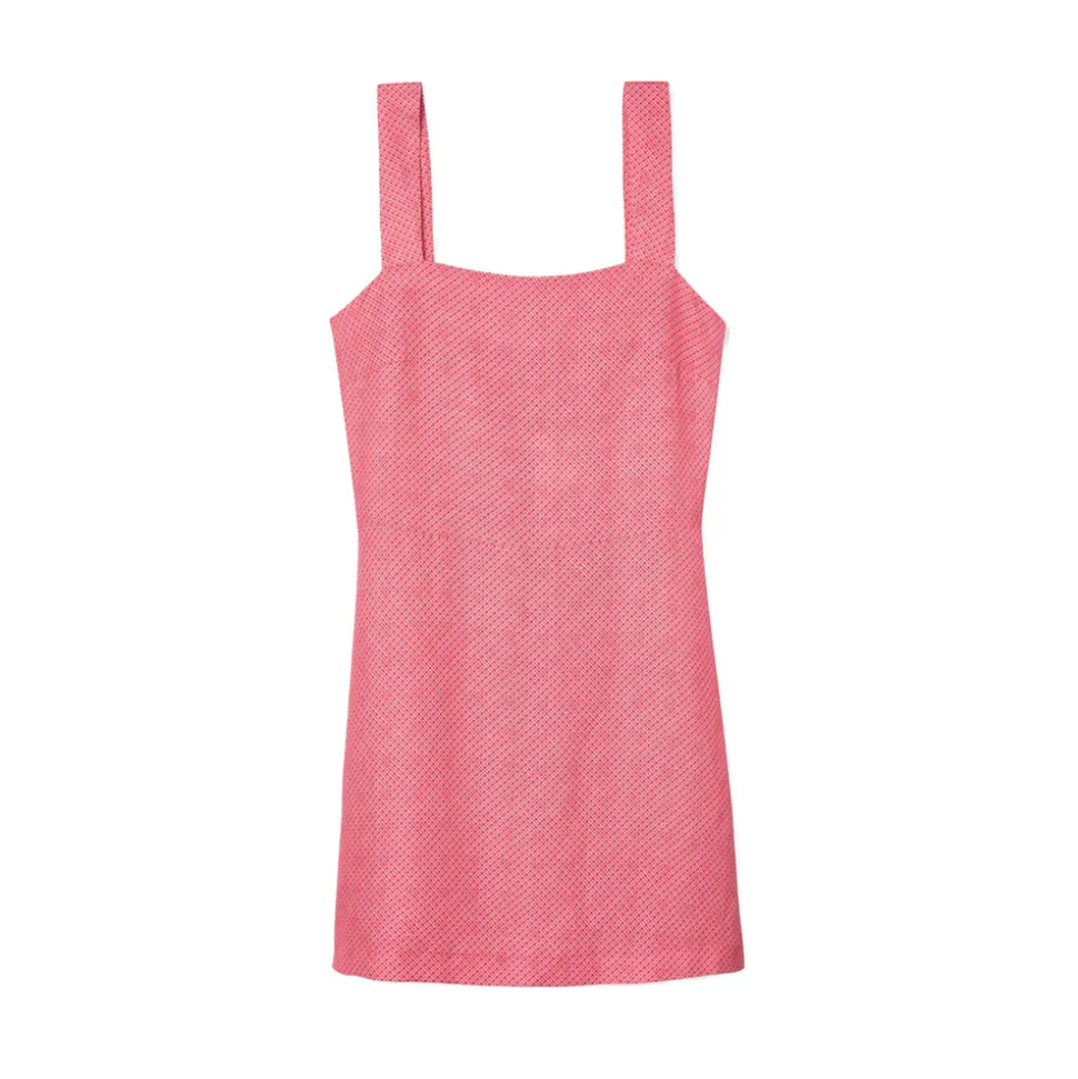 Made from lightweight, textured fabric in Clam Bake. Square neckline with wide shoulder straps. Fitted bodice with flared mini skirt for a flattering silhouette.