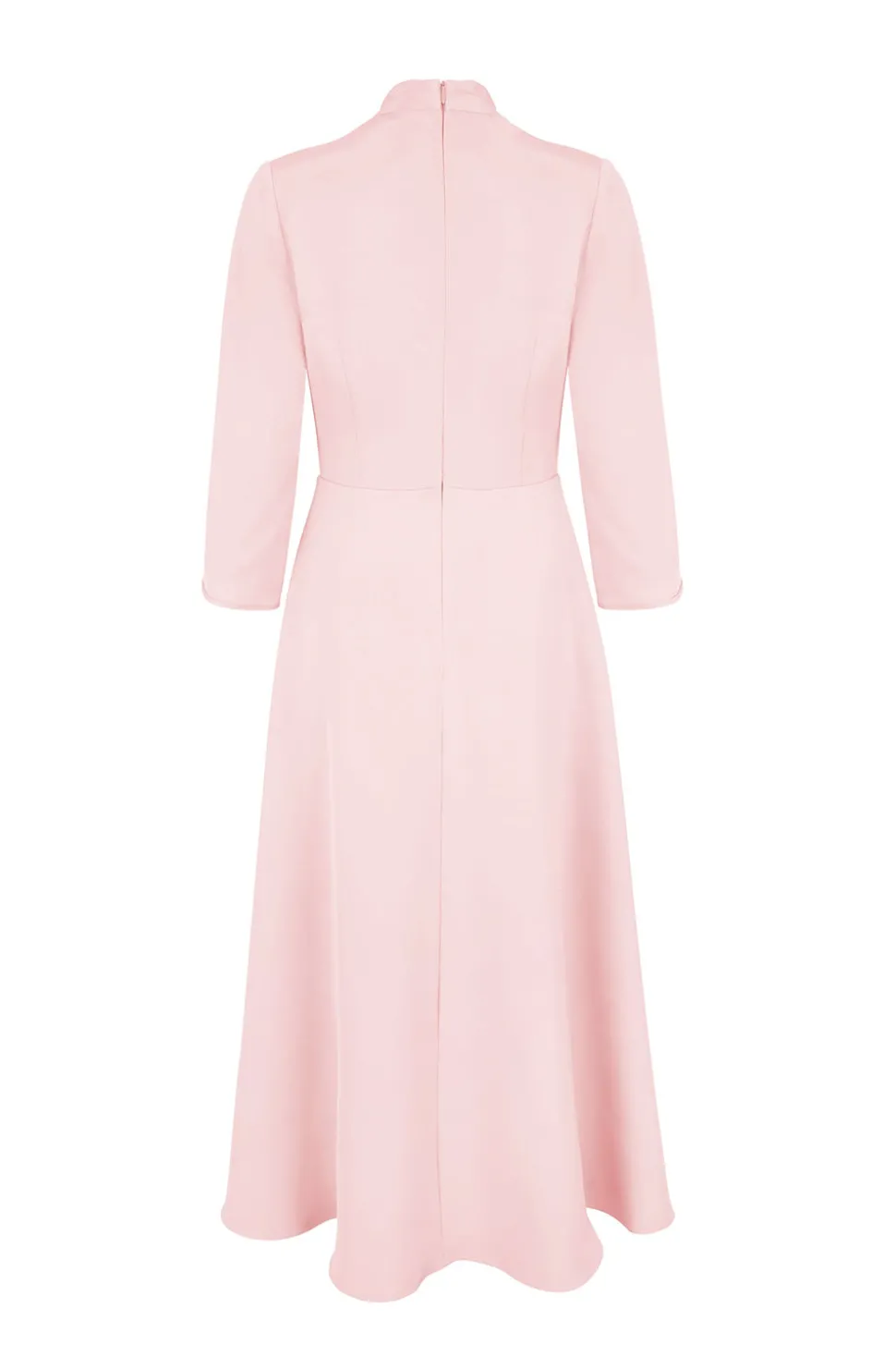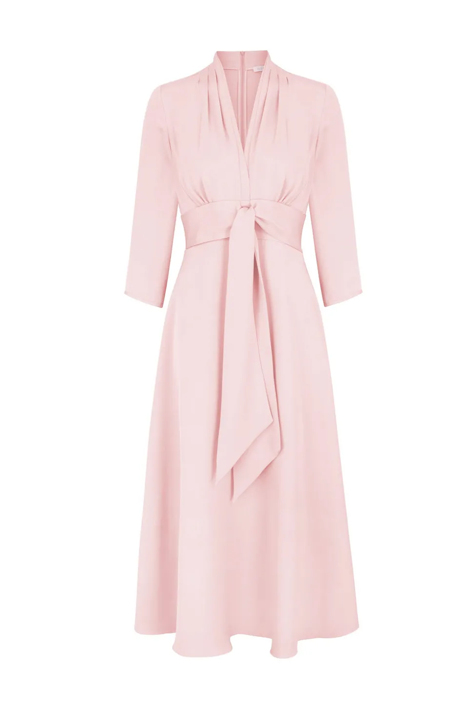 Since 2006, British designer Suzannah Crabb has been creating high-luxury womenswear pieces. Her creations are sustainably made, flawlessly crafted, ultra-flattering, and an excellent choice for all your special occasions, like this beautiful silk crepe dress, inspired by the classic lines and elegant proportions of the 1940s. Its elongated v-neckline elegantly frames the face while remaining demure enough for every event. A three quarter length sleeve, invisible zipper at the back, and mid-length A-line skirt all proportionally work together to create a timeless look. Style with soft neutrals and tonal shades of pale pink.