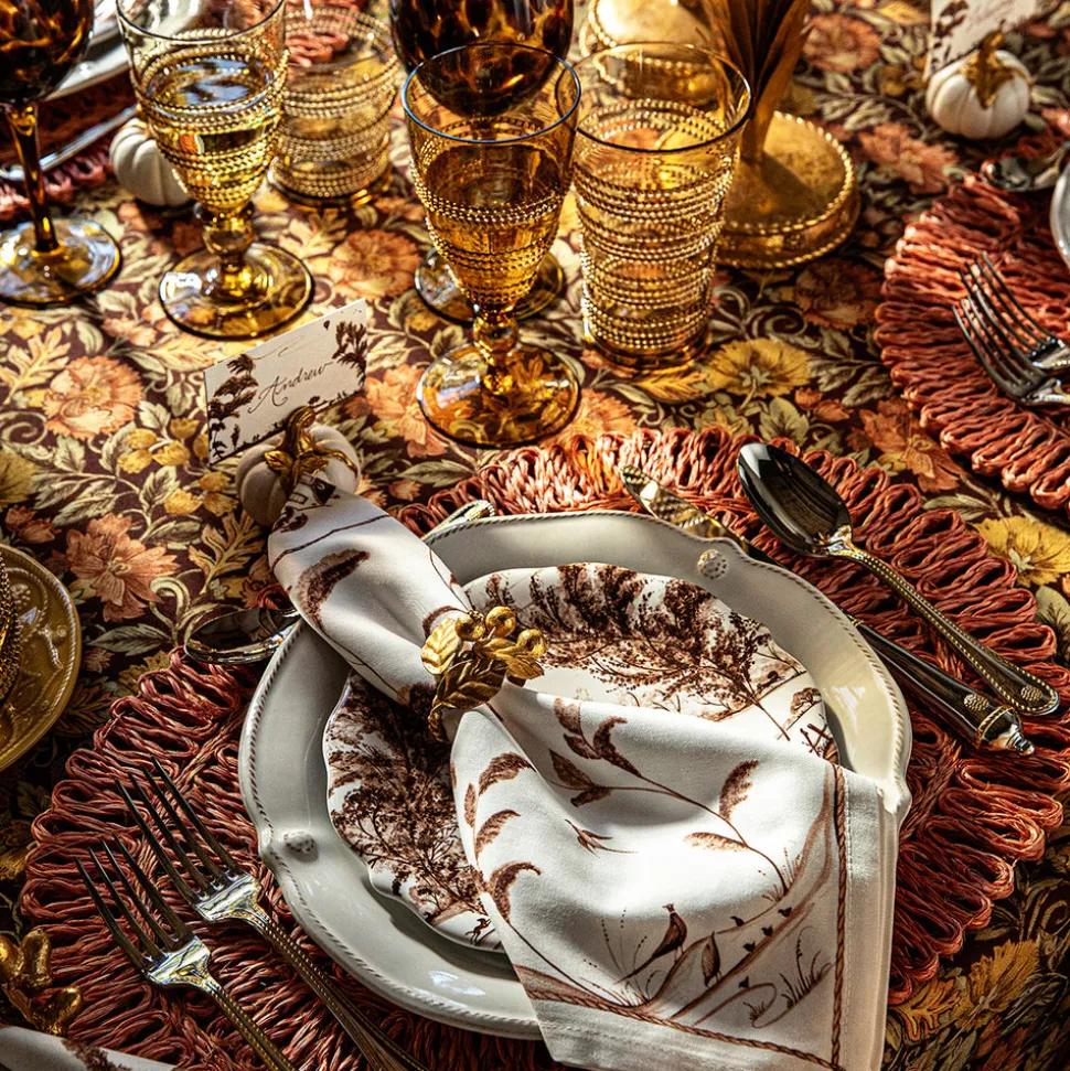 As newlyweds and self-proclaimed romantics, Capucine and David Gooding founded Juliska in 2001 with a small collection of mouth-blown glasses. Today, it’s the tableware and home brand every good hostess needs to know. The Forest Walk Leaf Napkin Ring Assorted in Gold, Set of 4, pays tribute to the quiet splendor of the autumn woods with lustrous gold finishes and intricate detailing. Each napkin ring features a unique cluster of leaves, blending elegance and whimsy for seasonal gatherings.