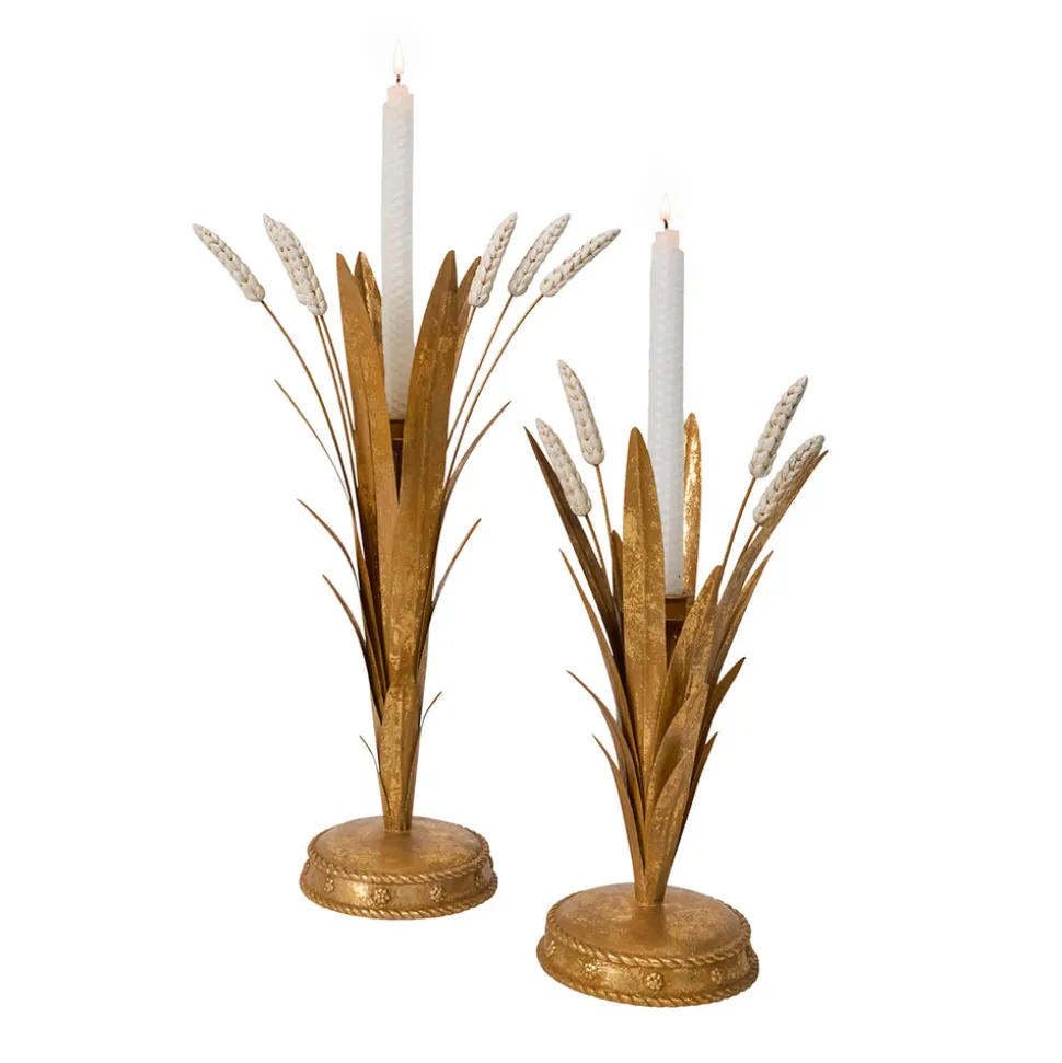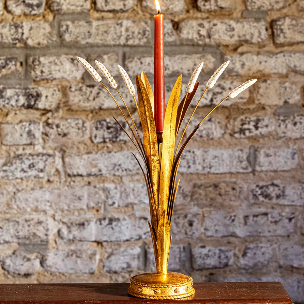 13″ candlestick crafted from hand-painted metal in a golden wheat motif. From Juliska’s Forest Walk Collection.