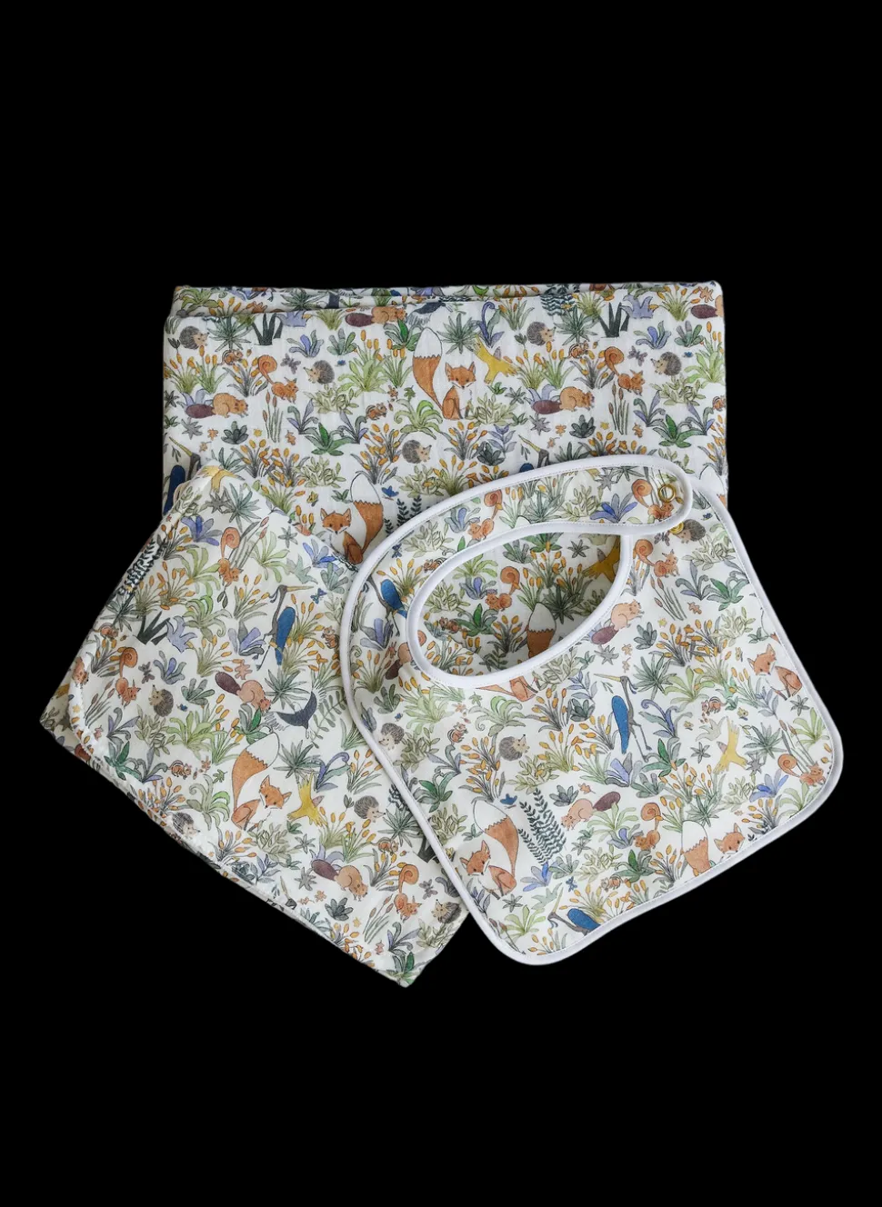 Something beautiful for mom and baby. Our Shawl Blanket, Perfect Bib and Burp Cloth, all in our Foxy Forest motif.
