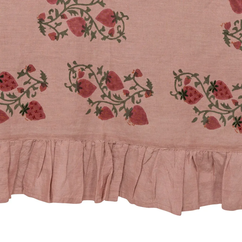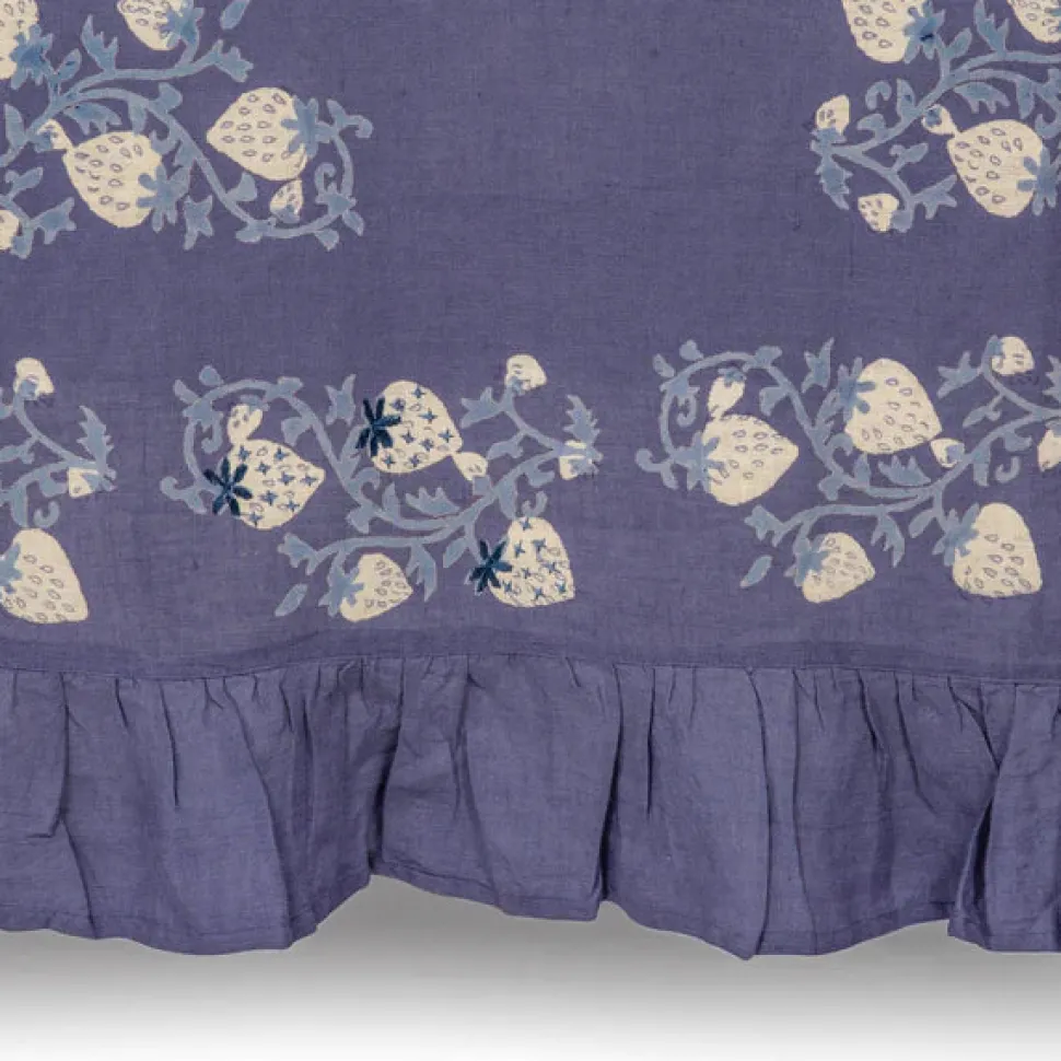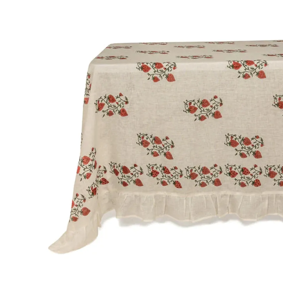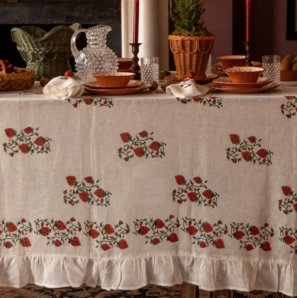 A former fashion and lifestyle journalist, Louise Roe founded Sharland England to bring inspiration and nostalgia to household items. The brand supports slow, meaningful design and traditional artisanship with tabletop, household, and rattan items built to last. Inspired by a vintage Suzani, the Fraises de Bois collection features an intricate hand-blocked pattern layered with hand-cross-stitching, with a whimsical ruffle on the borders. The Fraises Des Bois Tablecloth, adds a punch of color and a sophisticated base layer to any table and is available in cornflower blue, dusky pink, and crisp white.