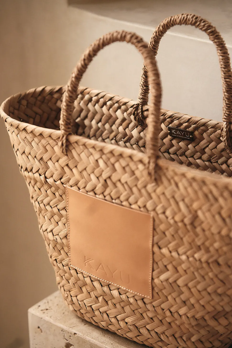 Designer Jamie Lim grew up in South East Asia, surrounded by the batik kaftans worn by her mother, and handmade rattan dining chairs. As she witnessed these artisanal goods be replaced by mass produced synthetics, Jamie created Kayu as a means to offer timeless personal and home accessories, made with the finest natural materials, and preserve indigenous craft. The Francisca Straw Tote in Natural is made from sustainable, straw and embellished with a leather logo patch. Toss in your beach towel and sunscreen for weekend getaways, then use it to carry all your daily essentials once you are back home.
